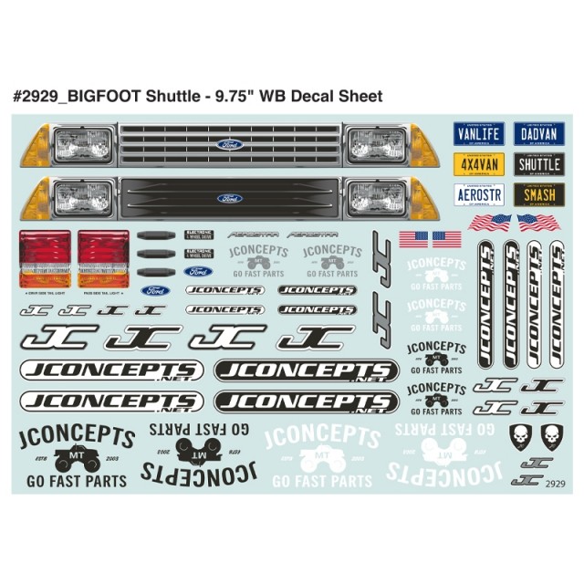 The unique shape of the body requires special and included #5120 angular front bracket for the standard front mount to position the mount at the correct angle for the van body. The included JConcepts rear body mount is built for the square post retainer located in Traxxas body mount kit #TRA3619 (not included). This provides a steady and dual post assembly for the rear with the capability to reach the top of the Aerostar van body. The clear body is packaged with licensed Ford Aerostar decal set, BIGFOOT®4X4 Shuttle decal sheet, injection molded body mount accessories, and window mask for quick and easy paint.