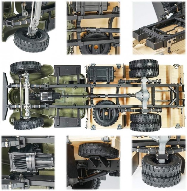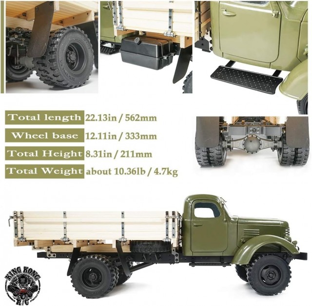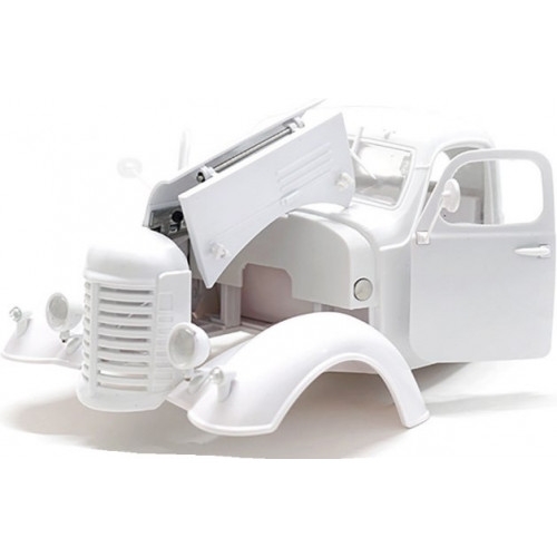 The cab is made from molded hard plastic and unpainted. Full interior included also made in hard plastic and unpainted. The rear bed is made of wood and is fully independent. Full leaf spring for front and rear. Full metal gears and bearings.