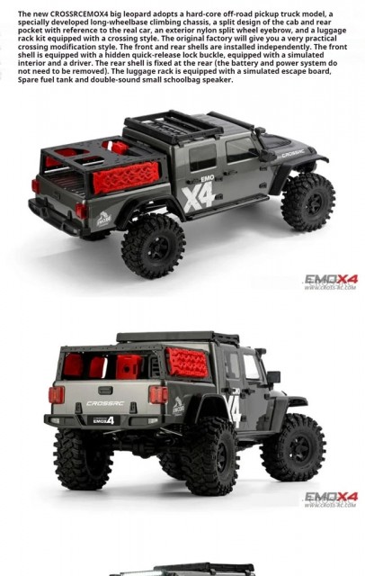 The CROSS RC EMO X4 is not just a toy; it's a fully-equipped off-road vehicle with a myriad of advanced features. The two-speed transmission and front and rear independent differential locks provide unparalleled control and traction, while the CNC threaded shock absorbers and beadlock wheels ensure a smooth and stable ride. The TALON MT tires are designed for maximum grip on any surface, making this crawler a formidable opponent in any off-road competition. The realistic roof rack, complete with simulated recovery boards, a spare fuel tank, and a dual-sound-effect small backpack speaker, adds to the authenticity of the RC experience, making it feel like you're driving a real off-road pickup truck.