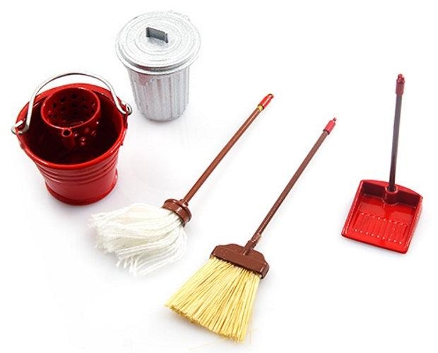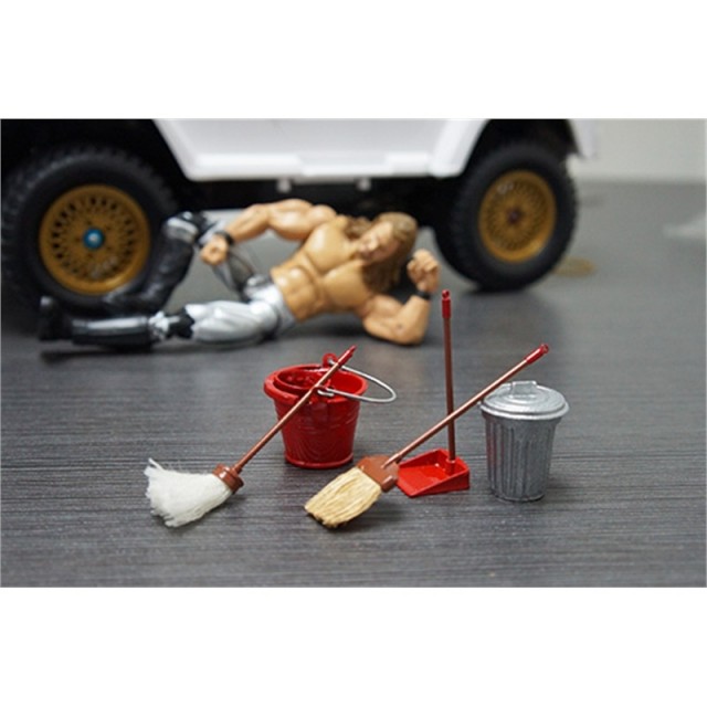 This is Yeah Racing 1/10 RC Crawler Garage Accessory Combo w/ Broom, Dustpan, Mop, Water Bucket, Metal Trash Bin.