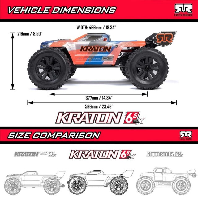 The chassis plate, differentials, front bumper, skid plate, and even the wing mount have all been improved with EXB (Extreme Bash) toughness. New side guards, a two-piece tower-to-tower brace, and inner body tower add more strength and simplify maintenance. The iconic KRATON monster truck body now comes in four striking new multi-color factory finishes, and has a convenient, quick-release, clipless body retention system.