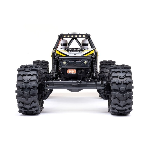 The scaled-down Capra tube chassis adds realistic trail buggy looks, with helmeted driver and passenger figures, LED headlights, rock lights, and light bar. Choose from two new paint scheme and livery options. One has a gray cage and blue body panels with licensed King Shocks livery. The other has a black cage and yellow body panels with licensed Mickey Thompson Tire livery.