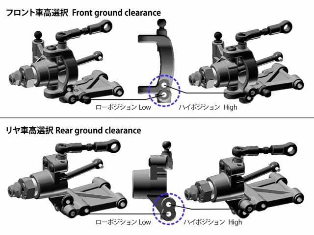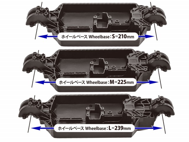 Dette kompakte akseldrevne 4WD-chassiset har en midtstilt motor foran og overfører kraft fra det sylindriske tannhjulet i midten via fremre og bakre mellomaksler. Batteripakken er stående og langsgående, plassert på venstre side, noe som bidrar til optimal balanse. Ved å endre bakseksjonen kan du velge mellom tre akselavstander. Den 4-hjuls uavhengige doble bærearmsfjæringen har aluminium oljedempere. Hjulvinkelen foran er 5 grader, og man kan velge mellom to typer bakkeklaring. Støtfangerens vinkel reduserer også overflatekontakt.