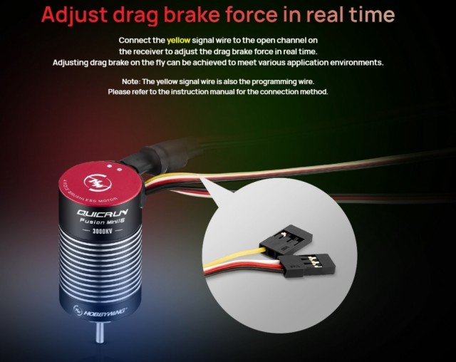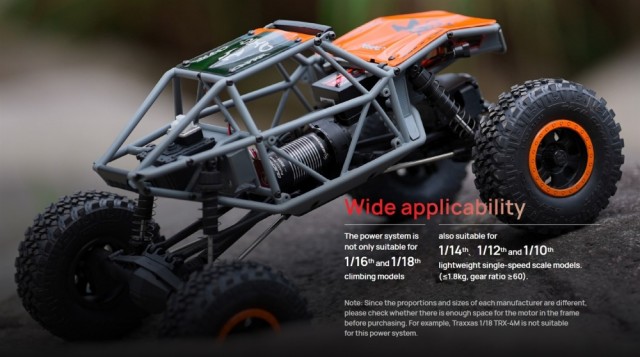 Utstyrt med en sterk innebygd brytermodus-BEC, leverer systemet en kontinuerlig strøm på opptil 4A og støtter veksling mellom 6V og 7,4V, noe som gjør det i stand til å drive høy-torque og høyspenningsservoer. Det inkluderer også flere beskyttelsesfunksjoner: lav spenning på batteriet, overoppheting, gass-tap og låsebeskyttelse. For enkel ESC-parameterinnstilling støtter den LED- og LCD G2/Pro-programboksene.