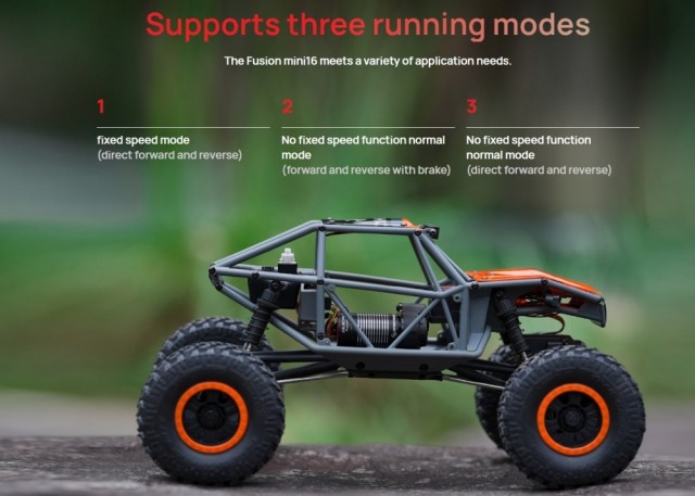 Hobbywing QuicRun Fusion Mini 16 2 in 1 FOC-integrert kraftsystem som er egnet for 1/18 og 1/16 skala modeller i bransjen. Rammeoppsettet er kompakt med dimensjonene 24x 42mm og en lett vekt på 72g (inkludert ledninger og plugger). Den lille størrelsen på Fusion Mini16 er estetisk vakker og løser ledningsproblemer på mindre crawler-kjøretøy. Fusion systemet kjennetegnes ved ekstremt stille gange og mye kraft/nøyaktighet ved lave turtall, perfekt for crawlere. Beregenet for bruk med 2-3S LiPo / 6-9 celler NiMh, og kommer med EC2 kontakt.
