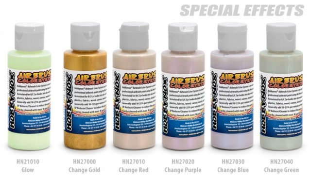 Hobbynox Airbrush Colors include Opaque (solids), Transparent, Neon, Pearl, Iridescents, Change & Glow.