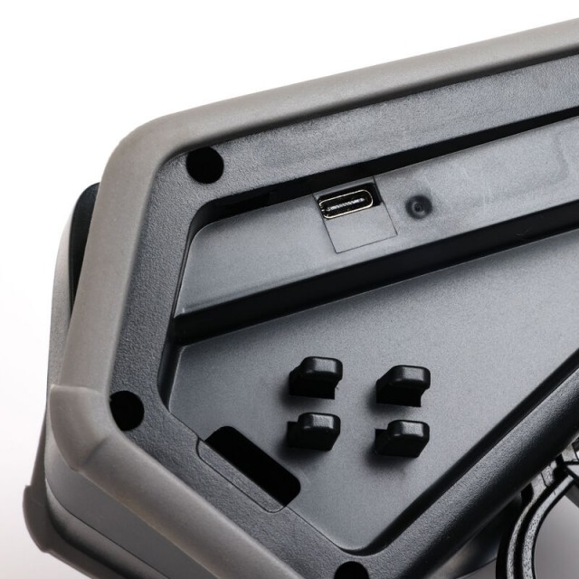 Molded Thermoplastic Polyurethane (TPU) bumpers surround the radio chassis to protect it against drops, bumps, and scrapes along the way. There's no external antenna to snag or worry about—a low-profile ridge on the chassis internally protects the robust high-speed signal output. A versatile front chassis guard enhances durability further and provides mounting options for user-integrated accessories such as a camera, light source, or anything else. The pair of lanyard mounting points allows drivers to keep the transmitter close and gain a free hand when not driving. An easy-access accessory compartment makes it possible to carry small tools, such as a T-wrench that easily snaps into the internal mount provided. We increased transmitter water-resistance* to give drivers peace of mind in rainy or wet conditions. Last but not least is an aggressive off-road style steering wheel that expands its ruggedness. It also includes an innovative thumb lever to make controlling your vehicle with one hand safer and more precise.