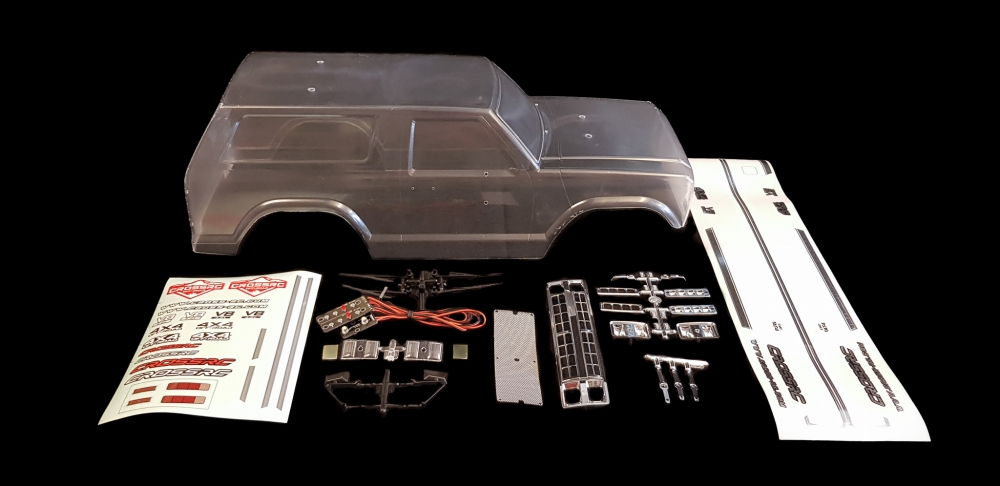 Clear, pre-trimmed body with protective film Fits - Traxxas TRX-4 Sport, Enduro, Axial, Vanquish 12.3" wheelbase