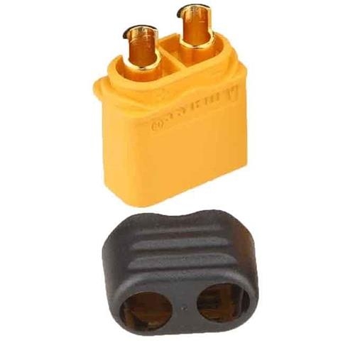 XT60 plugger utstyrt med koblingslokket som gjør at du slipper krympestrømpe på ledningene. Før ledningene gjennom koblingslokket og lodde de fast i kontakten. Koblingslokket klipses så fast i kontakten og du er ferdig.