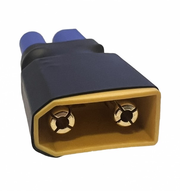 Praktisk og kompakt overgang fra EC5 til XT90. Ypperlig om man har f.eks batterier med XT90 -kontakter, som skal benyttes mot et EC5 oppsett