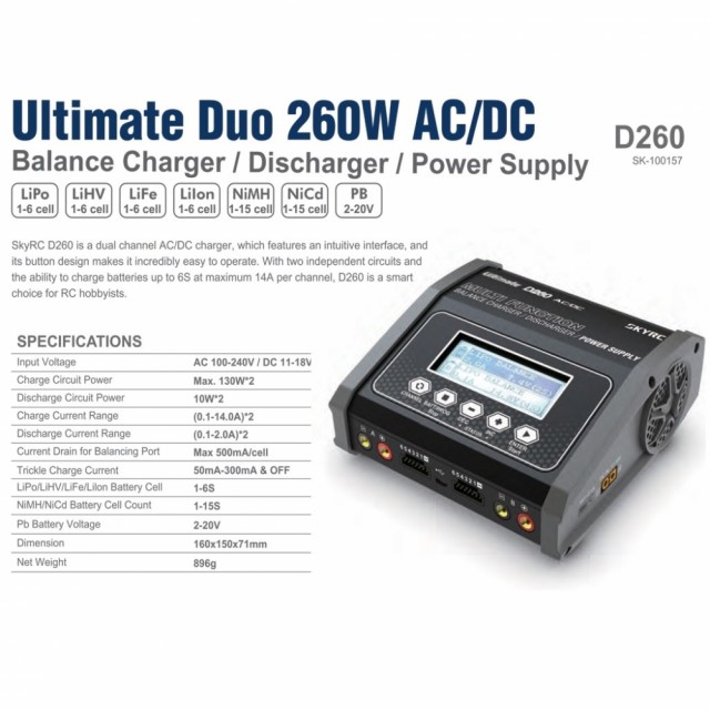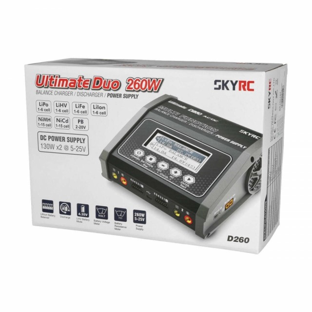 SkyRC Ultimate Duo D260 er en lader med to separate utganger som hver kan lade på max 14A med 130W begrensning. Laderen kan lade LiPo opp til 6S og også mange andre type batterier. Den kan brukes på vanlig 230V eller 12V-kilde og det følger med 2stk XT60 ladeledninger og strømkabel. Laderen har lettlest display som kan vise informasjon fra begge portene samtidig og gir informasjon om ladestyrke, spenning, hvor mye som er ladet inn i batteripakken med mer.