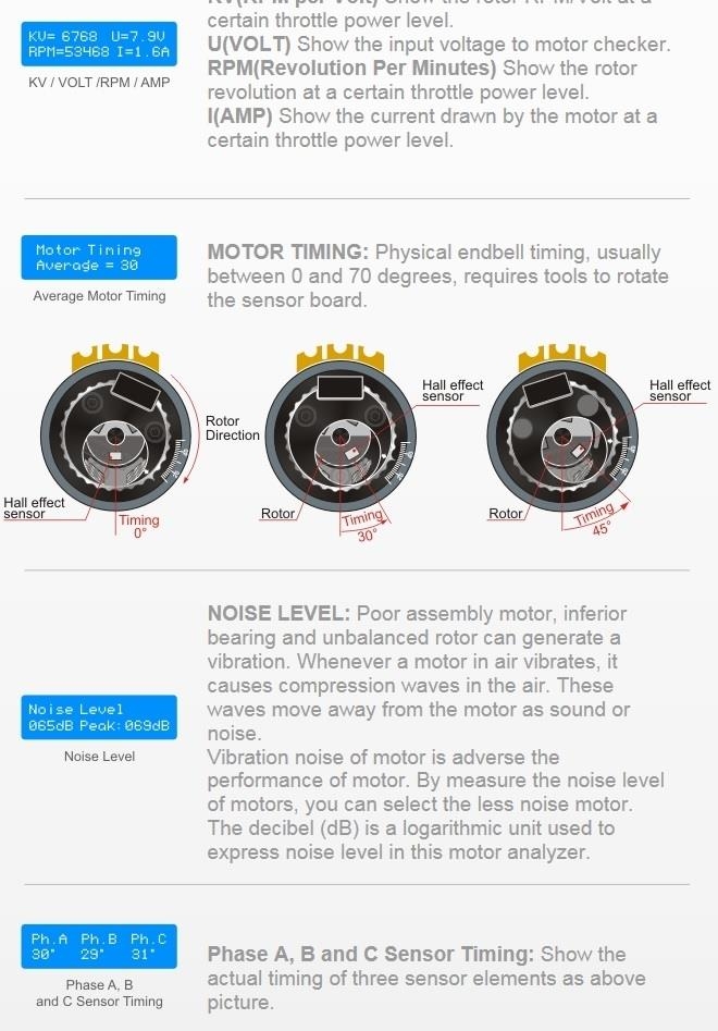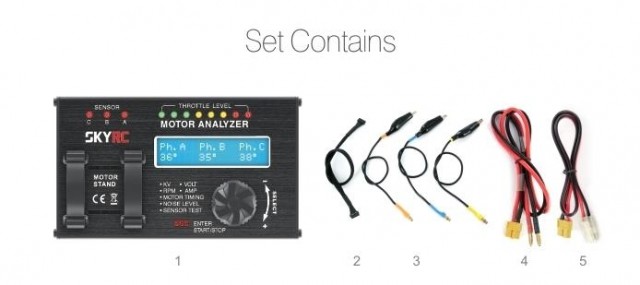 SkyRC motoranalyserer for børsteløse motorer, her kan man måle KV, spenning, turtall, amperetrekk, timing, lydnivå og hall effect sensorer.
