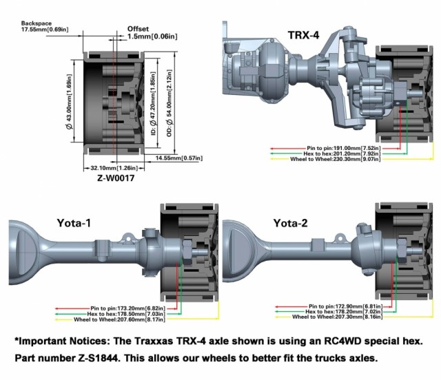 RC4WD Sasquatch 1.9” Beadlock Wheels (4) PrisNOK2 145,00 inkl. mva. På lager: 1 stk. Antall Kjøp Ønskeliste Lagerstatus: På lager: 1 stk. Artikkelnr.: Z-W0017 Produsent: RC4WD Del dette Produktinfo Produktanmeldelser (0) Sasquatch 1.9'' Beadlock Wheels Specifications: CNC Machined Billet Aluminum Fits Standard 12mm Hex Wheel Size: 1.9" OD: 2.14in / 54.0mm Width: 1.26in / 32.1mm Center Hole OD: 0.20in / 5.2mm Positive Offset: 0.06in / 1.5mm Each Wheel Weighs: 2.97oz / 84.4g Shown installed with RC4WD Milestar Patagonia M/T 1.9" 4.7" Tires (Z-T0184) for example (Not Included) Shown installed on Traxxas TRX-4 '79 Bronco Ranger XLT with RC4WD Milestar Patagonia M/T 1.9" 4.7" Tires (Z-T0184) for example (Not Included) Click image below to enlarge photo. What's Included: 4x Sasquatch 1.9” Beadlock Wheels 1x Miniature Scale Hex Bolt Tool (M2 Hex) (Z-S0626) Replacement Hardware: Steel Flat Head Socket Cap Screws M2.5 X 12mm Steel Flat Head Socket Cap Screws M2.5 x 8mm RC4WD Miniature Scale Hex Bolts (M2 x 6mm) (Silver) (Z-S1196) Miniature Scale Hex Bolt Tool (M2 Hex) (Z-S0626) Notes: Installing on Traxxas TRX-4 trucks requires the RC4WD 12mm Wheel Hex Conversion for Traxxas TRX-4 (Z-S1844) Due to many different methods to design tires and wheels, we have no control over other manufacturers products, so we can only tell you that RC4WD tires and wheels work together. In some cases, our wheels and tires will work with other brand wheels and tires, but we can not guarantee the outcome. Click here to see our full line of wheel specification comparison list. Skriv en produktanmeldelse og del dine erfaringer med dette produktet med andre kunder. Email Navn Din vurdering? 1 star 2 star 3 star 4 star 5 star 6 star Oppgi en tittel for anmeldelsen din Skriv inn produktanmeldelsen i feltet under