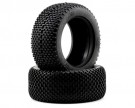 HB Khaos tyres have been designed specifically to suit a range of off-road racing conditions, and are perfect for loose dirt, clay, blue groove and damp tracks. They also work great on hard surfaces with a scattering of dust on top. The tire body has hundreds of wide rectangular lugs spaced around the carcass, providing excellent forward traction and mud-slinging ability to keep the treads clear and the tyre free from dirt build-up. The square sides of the treads give supreme cornering grip for extra confidence in technical track sections. Running down the centre of the tyre is a double row of tread blocks spaced even farther apart for excellent straight-line stability at high speeds. The carcass shape makes it perfect for rutted and bumpy terrain, because the curved sidewall doesn't dig in and cause grip-rolling through too much traction.