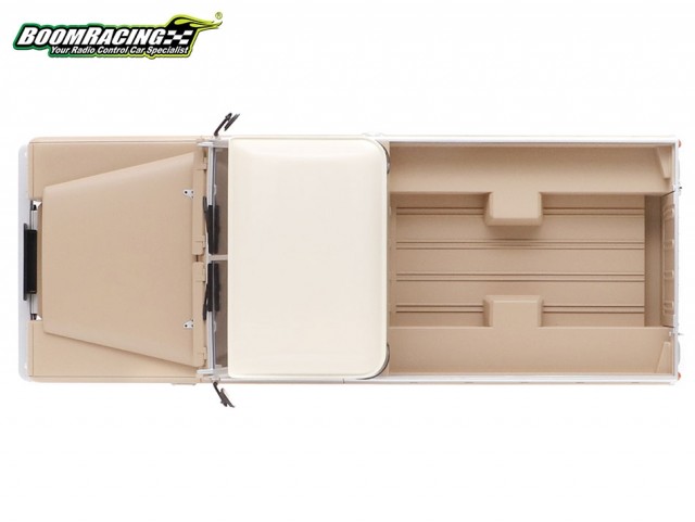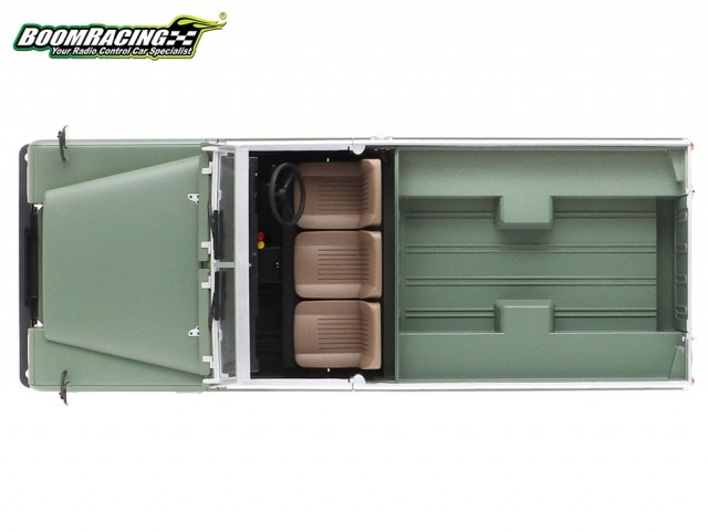 The body includes a fully molded ABS plastic interior with a dash, floor panel, adjustable seats for different figure sizes, gear stick, hi/low stick, 2WD/4WD stick, handbrake, pedals, clear windows, wipers, door handles.