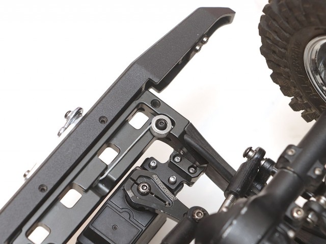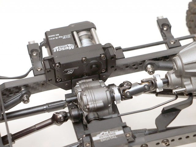 A pair of CNC aluminum winch mounts secure a standard-sized Muscle Winch servo winch on the BRX02 chassis.