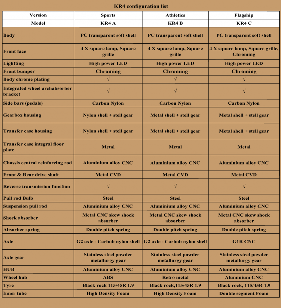 OBS: Modellen vist på bildene er kun for illustrasjon! Dette er et KIT som krever full bygging av hele bilen fra bunn, samt lakkering. Det finnes 3 forskjellige utgaver av KR-4, vennligst se tabellen under for detaljert beskrivelse av de forskjellige modellene.
