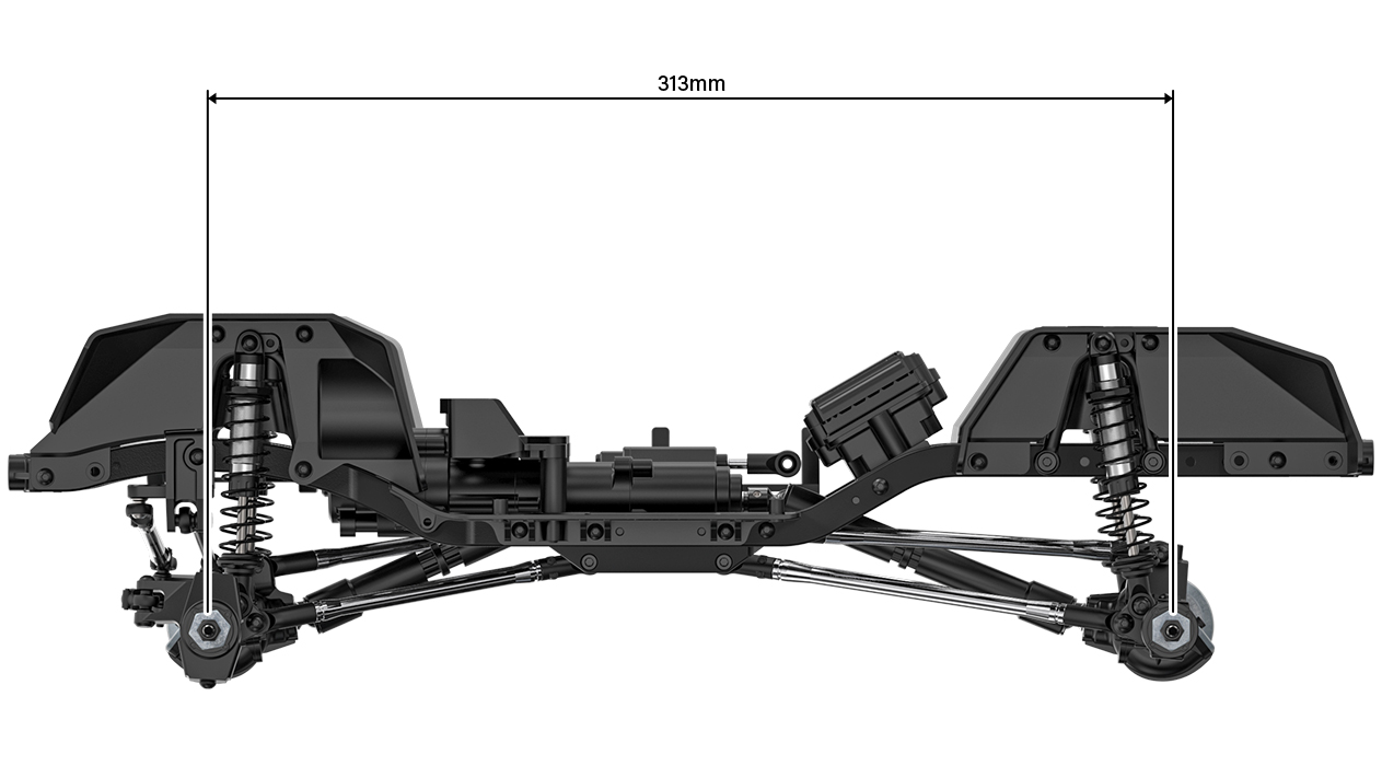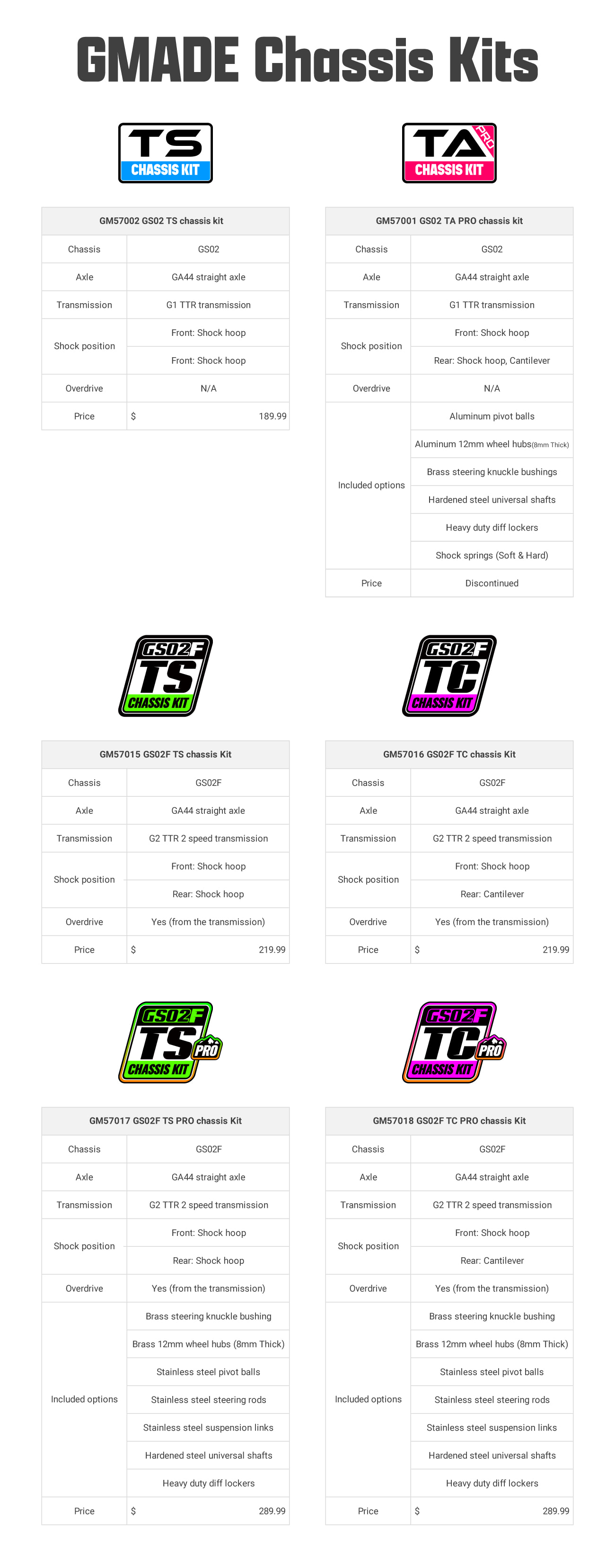 Gmade 1/10 GS02F TS chassis Kit PrisNOK2 995,00 inkl. mva. Utsolgt Ønskeliste Vurdering: (5) (1 anmeldelse) Lagerstatus: Utsolgt Artikkelnr.: GM57015 Produsent: GMade E-postvarsling Vi beklager, men produktet er midlertidig utsolgt. Legg igjen din e-postadresse og vi vil sende deg en melding så snart varen kommer tilbake på lager igjen. Jeg godtar vilkårene Registrer Del dette Produktinfo Produktanmeldelser (1) Product Details GM57015 - 1/10 GS02F TS CHASSIS KIT ASSEMBLE KIT Radio control / electric PERFORMANCE Complete assembly required for this kit. EQUIPMENT NEEDED (not included) STEEL LADDER FRAME GS02F frame is designed to look as a chassis of a real car frame and the material of the frame is made of high strength steel, C-channel side rail and is with hex wrench bolted with cross members, which make it resistant to twisting or warping. Also, steel parts are black powder coated finish to prevent rust. Inner Fenders The inner fender is directly fixed to the frame to reduce the flex and bending of the chassis and parts, it also reduces external objects to entering to the chassis during driving. ADJUSTABLE WHEELBASE The GS02F chassis allows 2 types of wheel bases. Basically set for 313mm and can be adjusted to 324mm for custom bodies. (Optional link kits are sold separately) Front weight balance GS02F's weight balance designed to be placed on the forward of the chassis. This will increase the tire traction to the front wheel to provide better crawling on a high tilt angle rocks and better driving performance when hill climbing and this will help minimizing the vehicle's rolling over when climbing. Front Mounted Motor Able to use 540 or 550 size motor with cooling fan with option. The motor is designed to mounted in front of the chassis, so it can increases more tire traction to the front side. Multiple Battery Locations GS02F can use all sizes of lipo batteries and Ni-MH batteries, and can be freely locate the battery position purpose of uses. Standard Pack(Max width: 156mm) Shorty Pack(Max width: 98mm) Adjust battery tray GS02F can use all sizes of lipo batteries and Ni-MH batteries. Chassis Mounted Servo system with panhard bar GS02F steering system has a steering servo on the frame just like a 1:1 real car. It is designed to make it as closed to the zero bump steer so bump steer movement does not appear by front wheel suspension movements, so we ended up with maximizing the steering performance of the vehicle. In addition, the Panhard-bar is designed to avoid interference with nearby parts, so that the front suspension and shocks can move freely without any loss. FRONT REAR FRONT AND REAR BUMPER MOUNT mount to mount: 43mm BODY POST Adjustable body is inclouded to mount different shape bodies Drivelines The drive lines of the front and rear axles are arranged in straight-line to reduce the fatigue stress of the universal shaft and reduce the loss of driving power by providing efficient driving lines. Transmission The GS02F transmission is designed to look as a real 1:1 scale vehicle, and provides the best performance according to the driving situation. Overdrive Overdrive means, front and rear wheels rotate at the different speeds. The GS02F transmission is designed to rotate the front wheel faster than the rear wheel. No overdrive (Option) 30T / 30T (GM30172) Various surface terrain,When there is a large percentage of driving on flat land. Overdrive percentage : 0% front wheel : 100rpm / rear wheel : 100rpm Overdrive 1 (Stock) 32T / 28T Various surface terrain. Overdrive percentage : 14.29% front wheel : 114rpm / rear wheel : 100rpm Overdrive 2 (Option) 33T / 27T (GM30168) Extreme surface terrain. Overdrive percentage : 22.22% front wheel : 122rpm / rear wheel : 100rpm Better steering radius Vehicles with overdrive on the front axle has an improved steering radius compared to non-overdrive vehicles, making it easier to control when driving on the rough surfaces. Better climbing Increasing of the tire traction allows the vehicle to pass through steep slopes and obstacles without lifting the front of the body upward. 2-speed HI/LO transmission The 1st gear is for hardcore rock crawling and the 2nd gear is for hill climb or high-speed driving. torque Twist Reduce transmission GS02F transmission is designed to drive in a stable position without pulling the balance of power transmitted to the axle. The front and rear universal shafts based on the transmitter each rotates clockwise and counterclockwise, this compensates for the forces acting on the opposite rotational forces due to the action(torque) and reaction(reverse torque) because of that this vehicle can run in a super stable conditions. Easy adjust motor mount You can easily replace and install the motor pinion gear to changing the gear ratio. Dual slipper clutch The slipper pads are designed to hold the spur gears evenly to allow more precise setting. All metal internal gears Hardened carbon steel universal joints The front and rear universal shafts of the steel joints provides smooth and stable power train. The kit also includes the spare parts that allows you to adjust the length of the universal shaft. GA44 Axle GA44 axle is designed with the hardcore rock crawler in mind. Axles are made of high-strength meterials, and it will look and perform optimum off-road perfermance as real 1:1 vehicle when 4-Link suspensions added. The GA44 axle housing is a durable one-piece type. The angle of the differential cover is designed to reduce the risk of damage due to frontal impact and is therefore very suitable for off-road driving. Front axle Kingpin angle Keeping the scrub radius to a minimum to let your steering servo work at it's full potential and increases the steering efficiency. Rear axle Hi steer knuckle arm By increasing the approach angle, you can over climb the obstacles more easily than a typical trial trucks. adjustable castor The GA44 front axle can be adjusted to the steering style to have a smooth and short turn angle