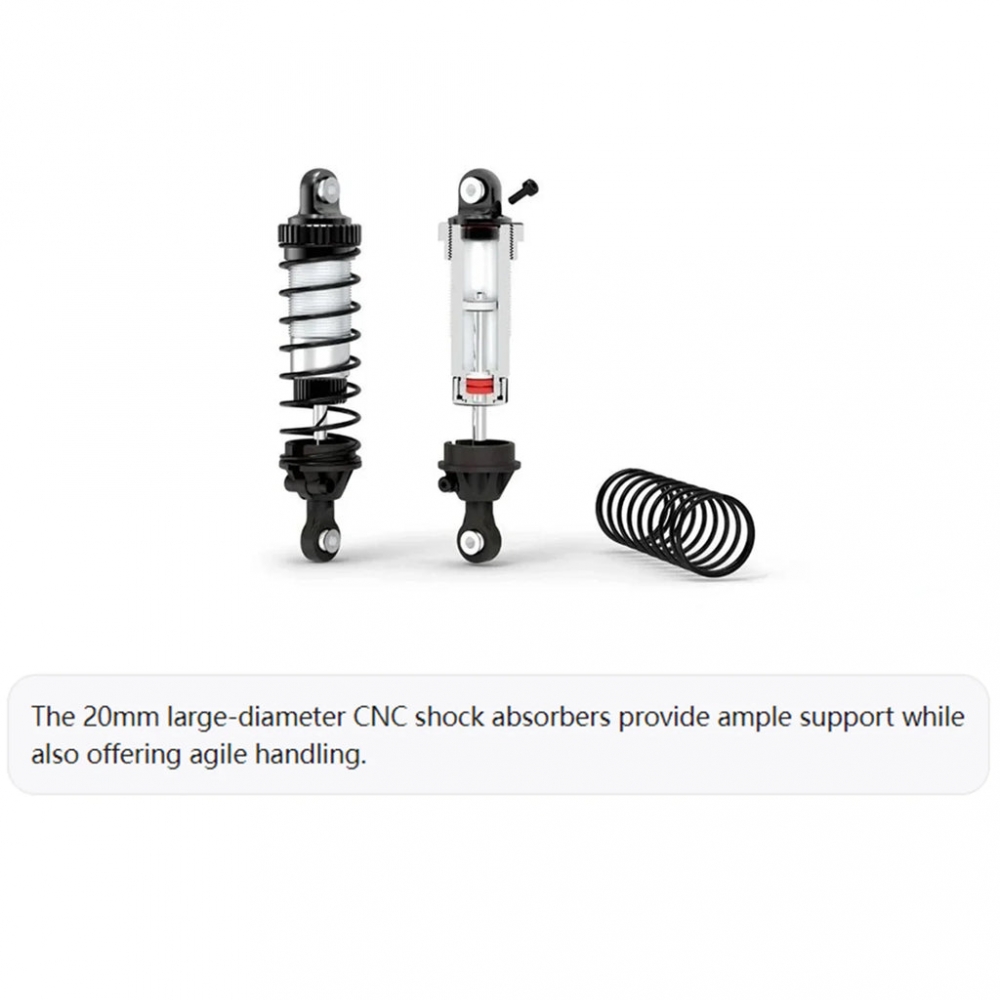 The EMO X4 Big Leopard comes with high performance right out of the factory: featuring an off-road pickup truck design, long wheelbase climbing chassis, full vehicle linkage light set, high-power spotlights, two-speed transmission, front and rear independent differential locks, CNC threaded shock absorbers, beadlock wheels, and TALON MT tires. The front and rear shells are independently mounted, with the front shell equipped with hidden quick-release locks, realistic interior and driver, and the rear shell fixed at the tail (no need to remove it when replacing the battery and power system). The realistic roof rack is equipped with simulated recovery boards, a spare fuel tank, and a dual-sound-effect small backpack speaker.