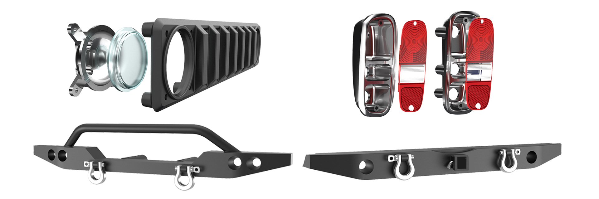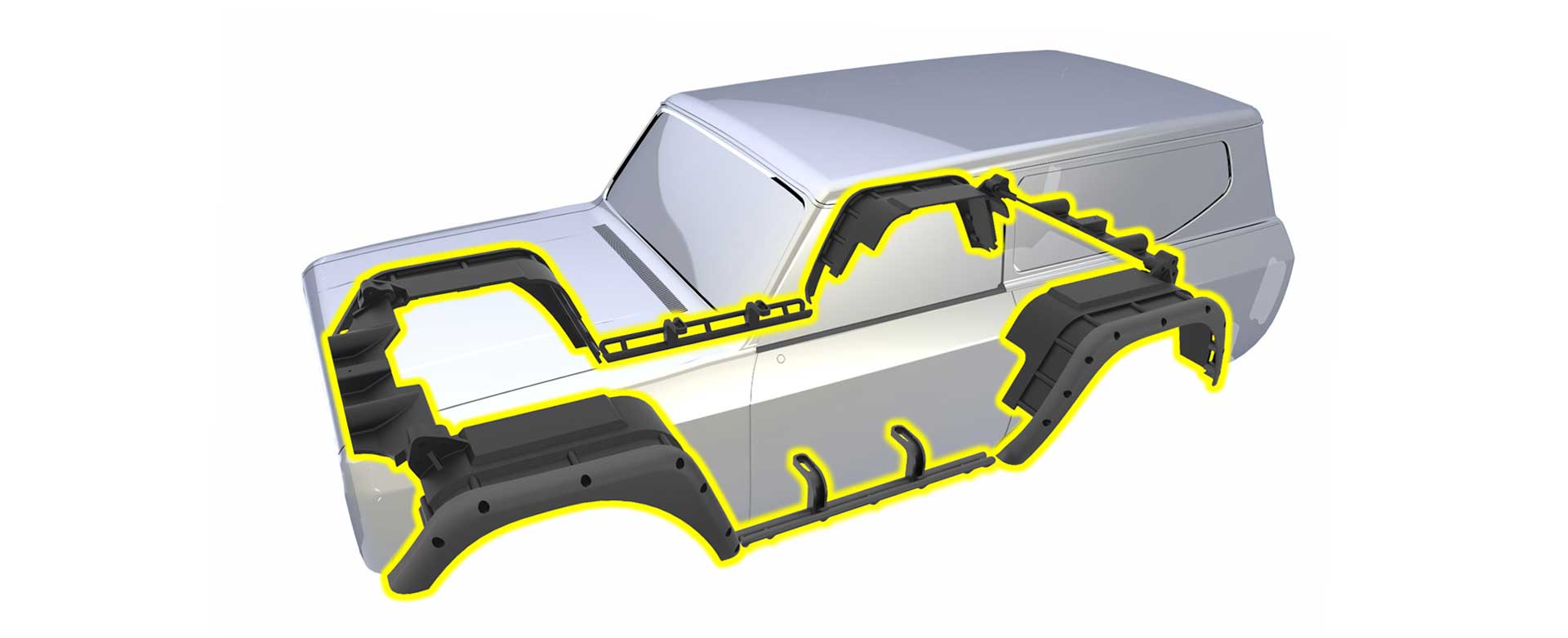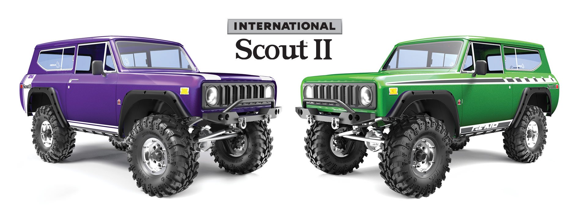 - Licensed International Harvester Scout II body, Hard plastic grill, LED ready body and bumpers, Plastic folding mirrors, Molded inner and outer fenders, Licensed Interco Super Swamper tires, Shackle mount bumpers (LED ready), Plastic rock sliders