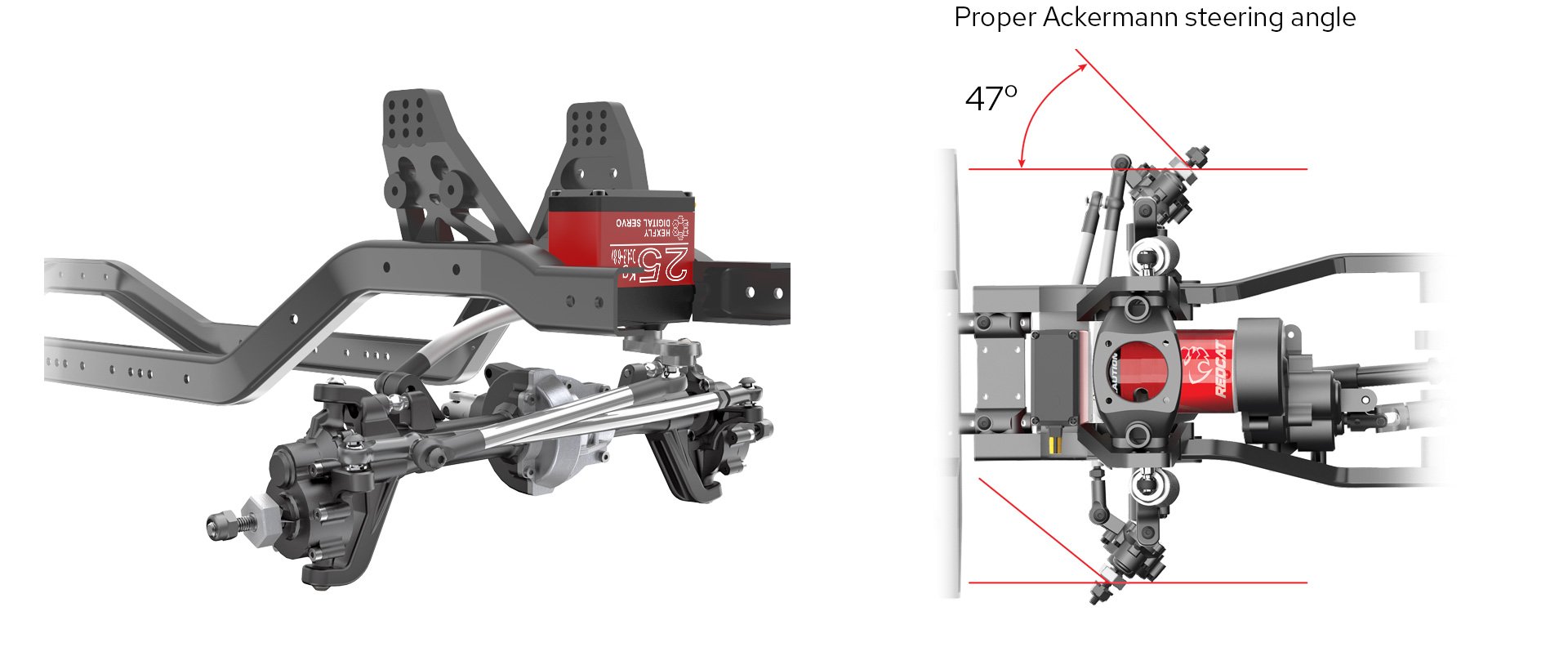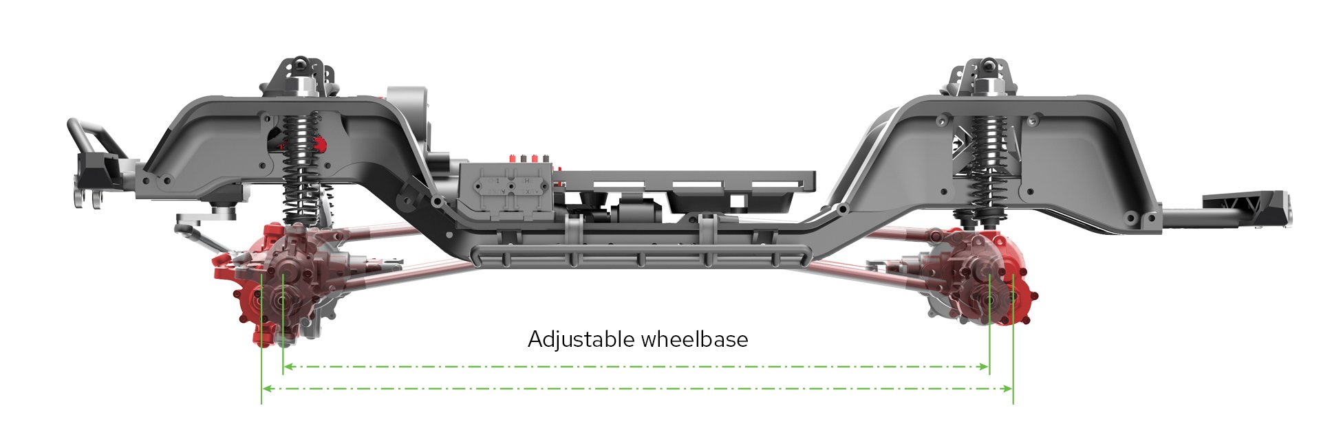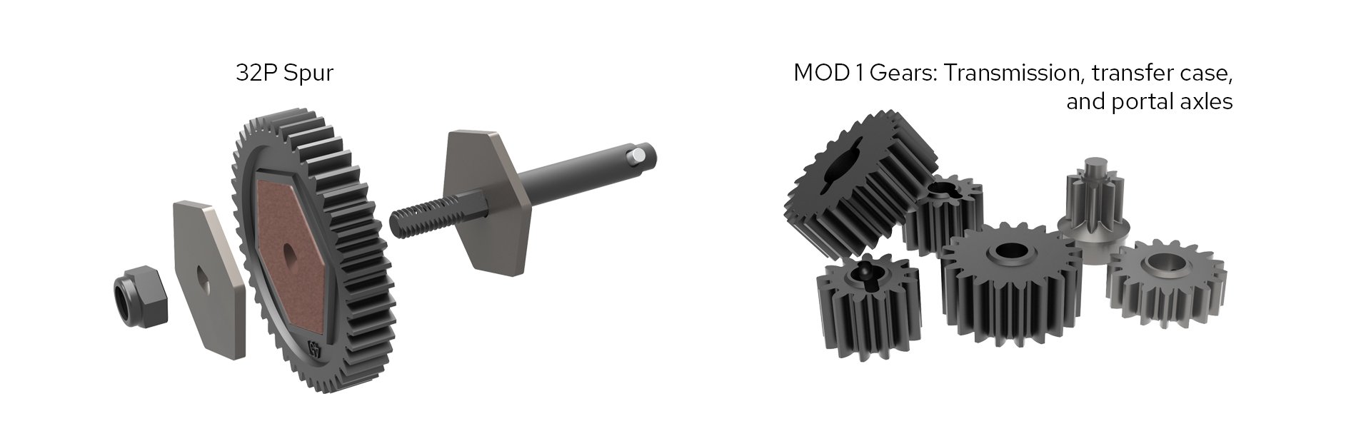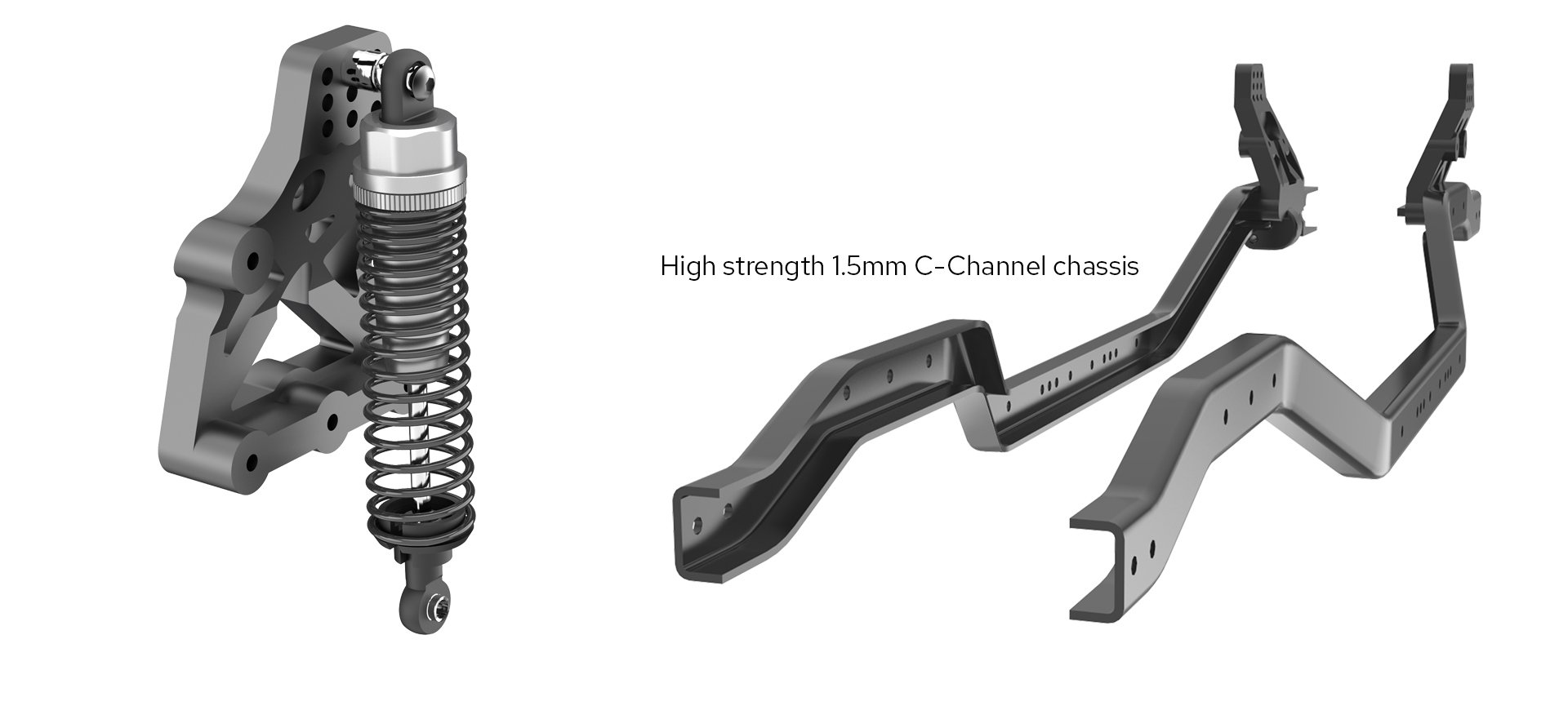 - Portal axles, Divorced transfer case, High strength 1.5mm C-Channel chassis rails, 4-Link suspension, Aluminum threaded shocks, Functional 1.9 beadlock wheels, CNC machined spools, Metal wheel hexes, Rubber sealed ball bearings throughout, 47º precision steering, Panhard bar, Front mounted motor.