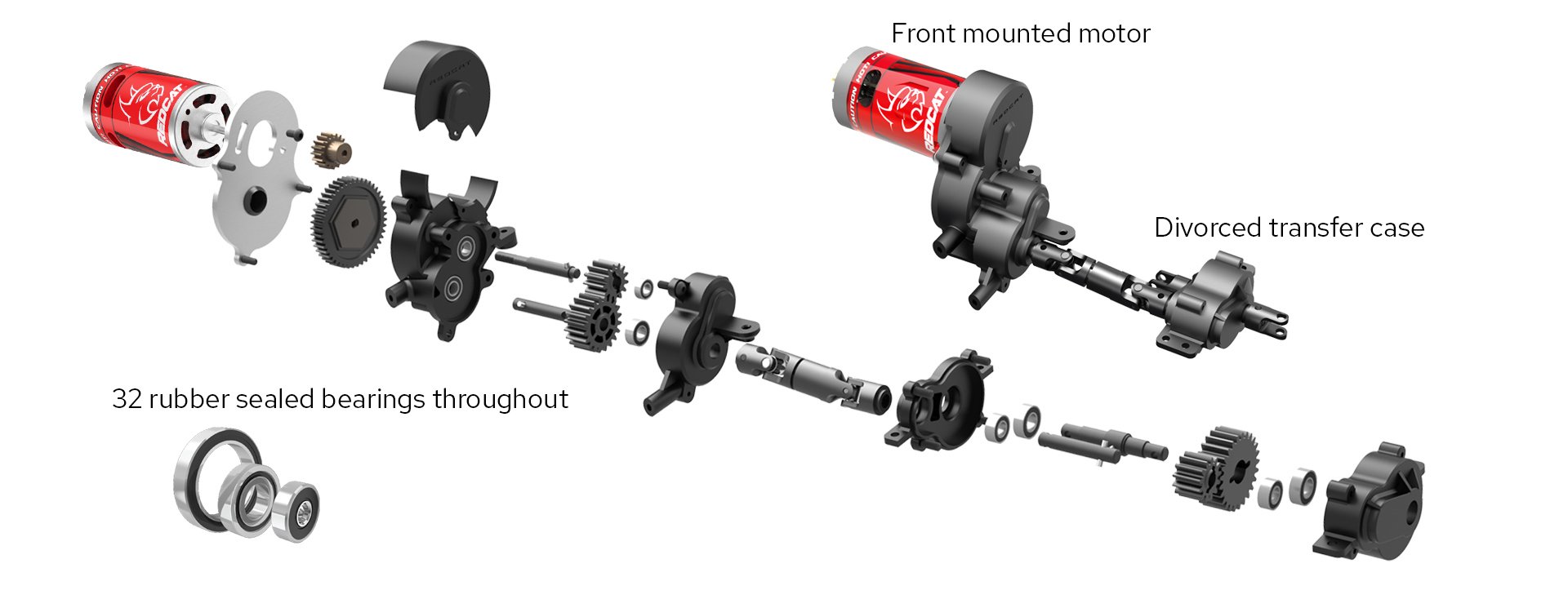 The Gen8's over-built transmission and transfer case feature massive Mod 1 gears, which are designed for hard core crawling of the most grueling conditions. A sealed pinion and spur keeps the gears safe from rocks and debris. Adjust your gearing to fit most motor and driving styles with easy fitment of 9T to 23T pinion gear allowing gear ratios of 28.12 to 71.85. The Redcat Racing GEN8 features a front mounted motor, a divorced transfer case, and 32 rubber sealed bearings through the vehicle.