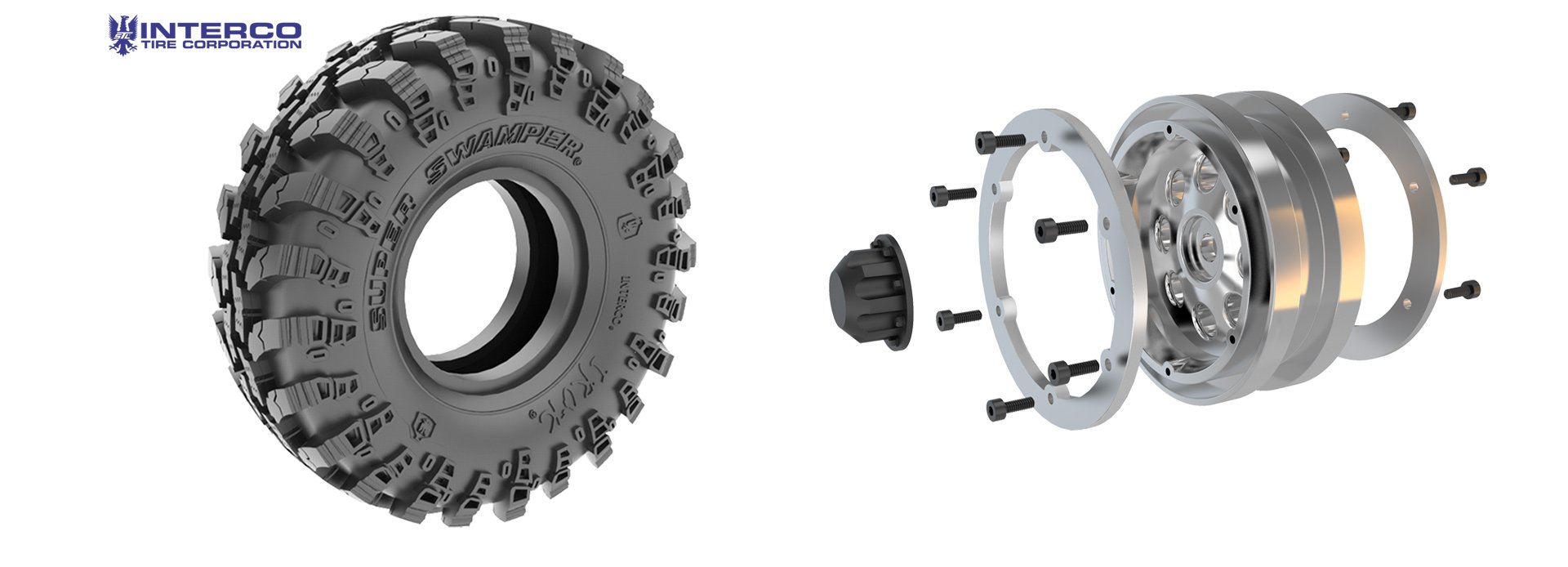 True to scale, licensed Interco IROK Super Swamper tires and functional beadlock wheels pull the Gen8 V2 through the toughest terrains. Each wheel uses inner and outer beadlock rings for maximum strength and tire holding capability.
