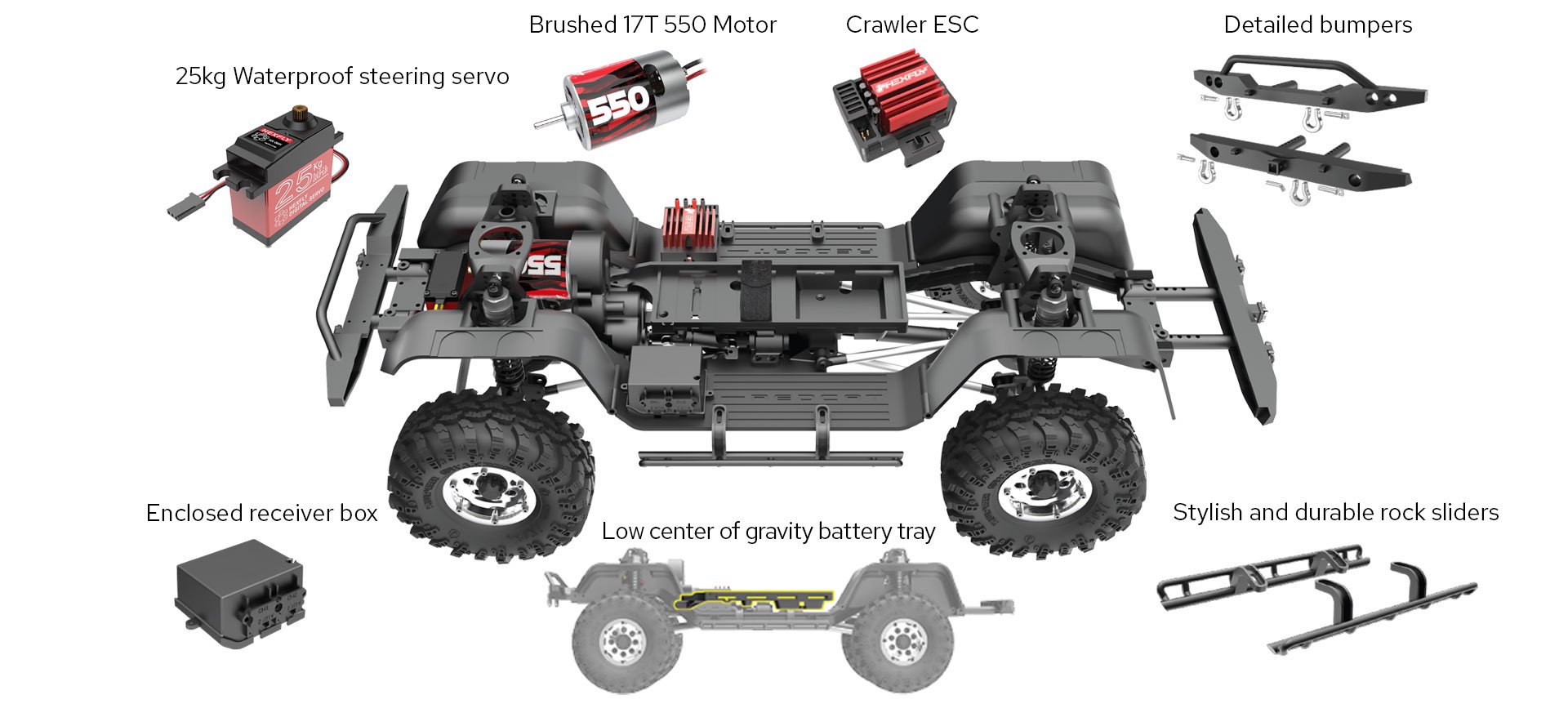 - 17T 550 brushed motor, Waterproof crawler ESC, Hexfly waterproof steering servo, 2.4GHz radio system.