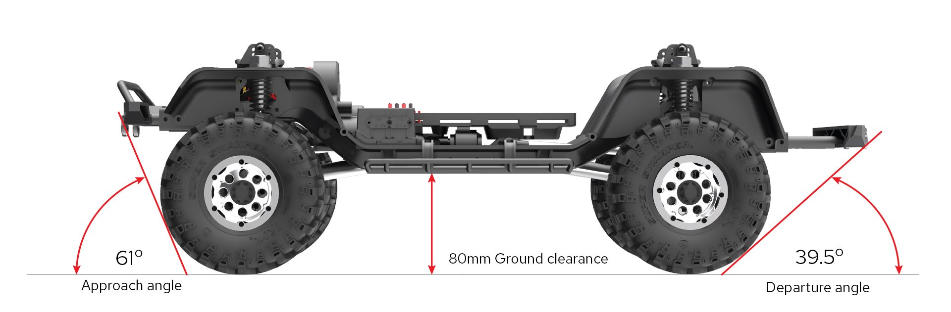 The Redcat Racing GEN8 V2 makes it easy to conquer all types of terrain. The stock configuration offers users 73.4mm of ground clearance, a 61 degree approach angle, and a 39.5 degree departure angle.