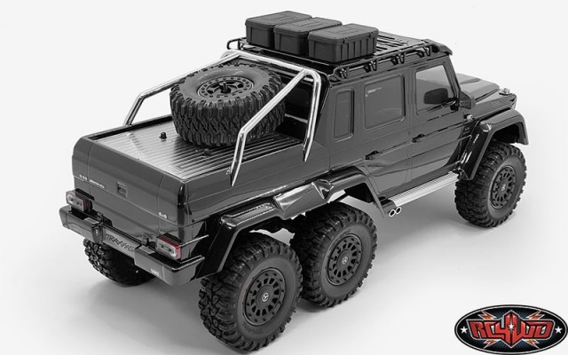 Shown installed on Traxxas Mercedes-Benz G 63 AMG 6x6 with Adventure Steel Roof Rack for Mercedes-Benz G 63 AMG 6x6 (VVV-C0921), 1/10 Heavy Duty Cargo Box (VVV-C0936), Tonfa Side Sliders for Traxxas Mercedes-Benz G 63 AMG 6x6 (Silver) (VVV-C0974) and TNK 2.2" Beadlock Wheels (4x) (VVV-C0986) for example (Not Included)