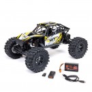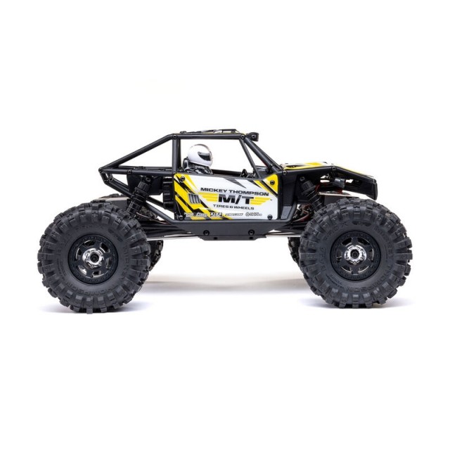 The scaled-down Capra tube chassis adds realistic trail buggy looks, with helmeted driver and passenger figures, LED headlights, rock lights, and light bar. Choose from two new paint scheme and livery options. One has a gray cage and blue body panels with licensed King Shocks livery. The other has a black cage and yellow body panels with licensed Mickey Thompson Tire livery.