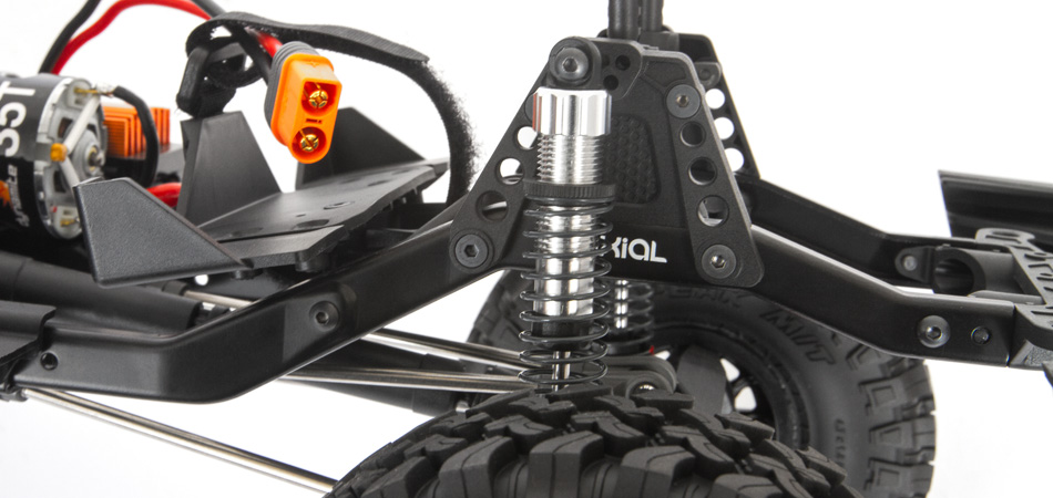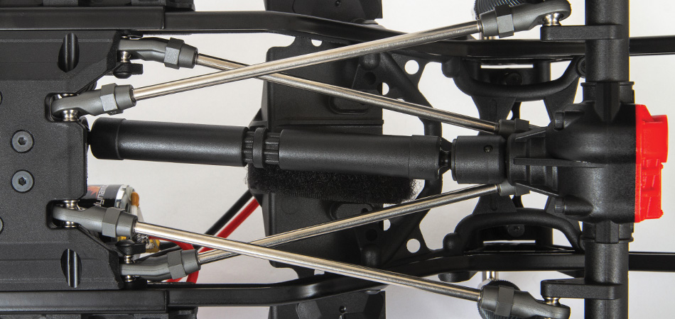 The front suspension geometry of the SCX10™ III Base Camp 4WD is optimized to reduce bump steer, while the rear 4-link reduces torque twist.