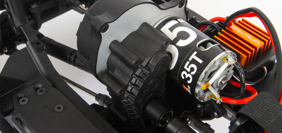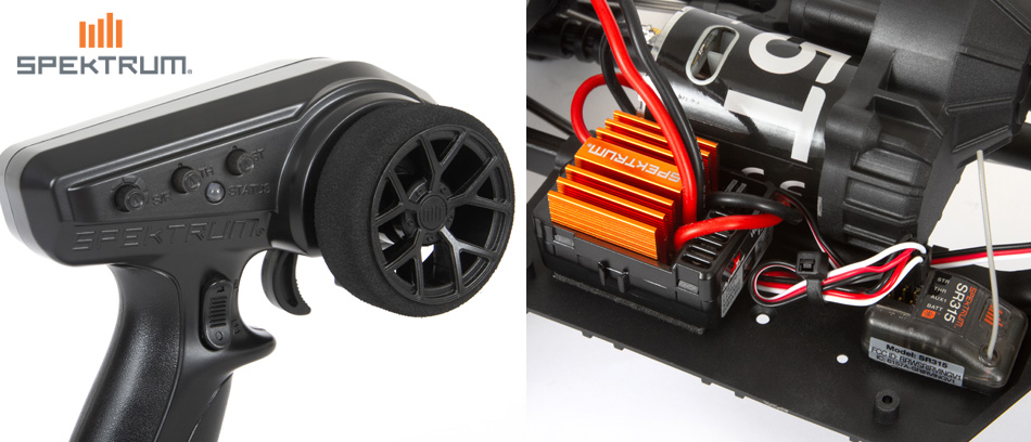 The included SLT3 3-channel radio with SR315 Dual Protocol receiver provides dependable SLT 2.4GHz control now and next-level DSMR® upgrade potential for the future. User-adjustable features include steering and throttle trims, steering rate, and throttle limits. The transmitter’s foam-covered steering wheel allows no-slip control.