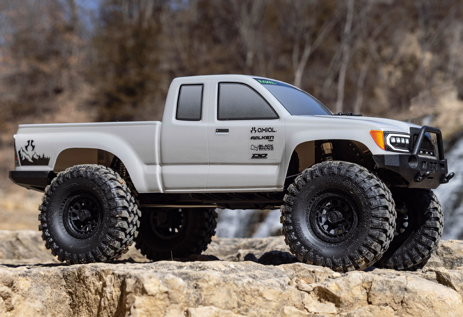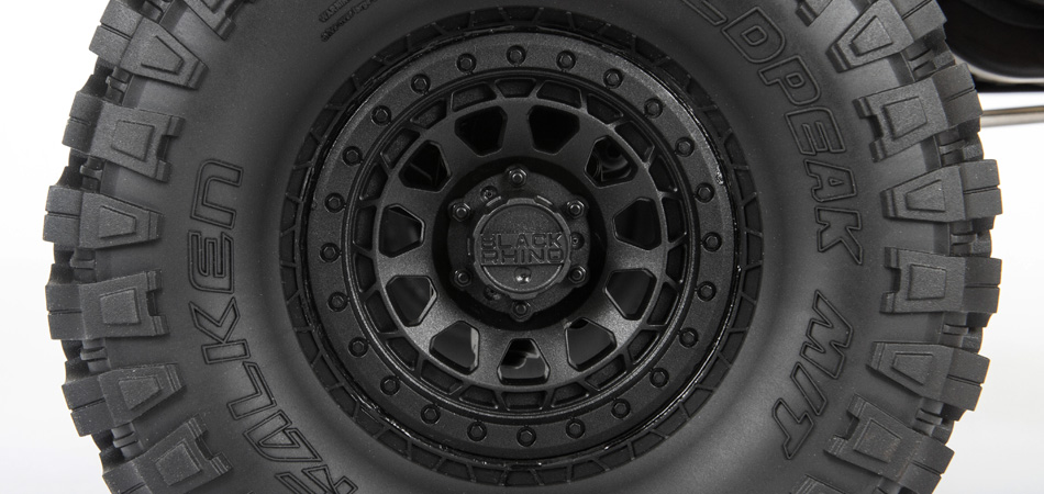 Officially licensed Black Rhino wheels add scale looks. The R35 compound Falken Wildpeak tires included with the SCX10™ III Base Camp™ 4WD provide good ground clearance and a secure grip on dirt, rocks, and all other off-road surfaces. The wheelbase is 313mm.