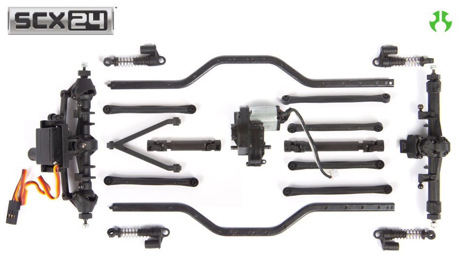 The front and rear axles consist of a two piece, molded plastic solid axle design. For optimal handling, the SCX24™ suspension features a three-link front and four-link rear setup.