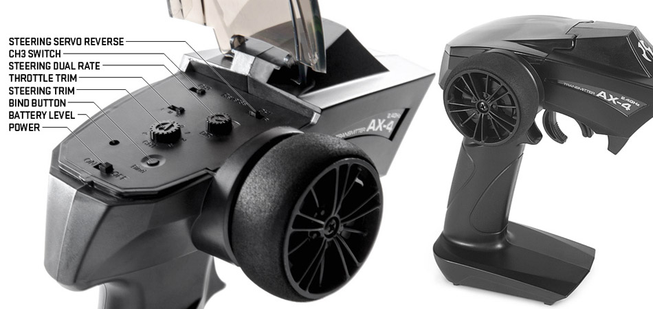 The AX-4 transmitter features a throttle trim knob for low, medium, and high speed setting, a switch for steering servo reversing, steering dual rate, a switch for third channel applications (aux port on the ESC/Receiver), steering trim, battery level indicator, a bind button, and on/off switch.