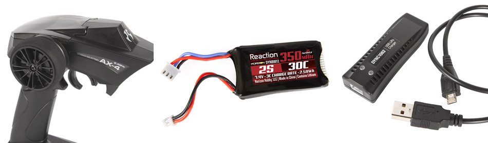 The SCX24™ includes everything you need to get going. The product is fully assembled, and we´ve included batteries for the transmitter, and a LiPo battery pack and USB charger.