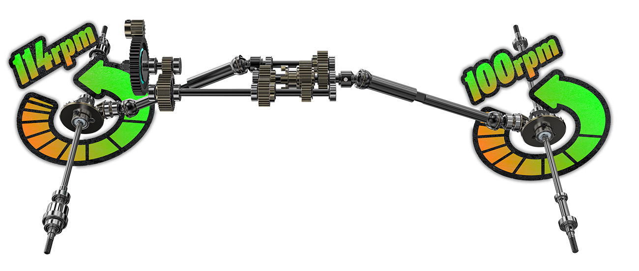 The GS02F transmission is designed to rotate the front wheel faster than the rear wheel.