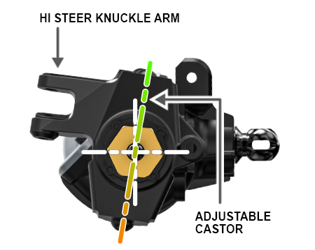 • The GA44 front axle can be adjusted to the steering style to have a smooth and short turn angle depending on the driving style or to adjust to improve straight stability by changing the caster angle.