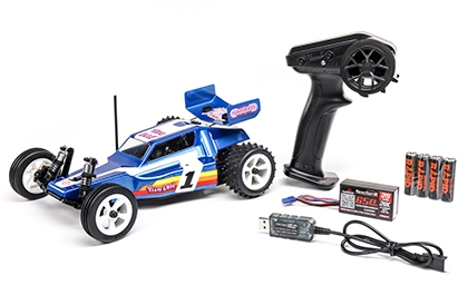 For years, racing enthusiasts demanded a re-release of the JRX2 buggy, the original vehicle that made Losi a worldwide force to be reckoned with, and now they get their wish in a 1/16th scale package. The Losi Mini JRX2 Buggy honors its roots by creating a mini buggy with a classic look and 21st-century performance. With a 5-link rear suspension providing maximum grip in loose conditions, aluminum shocks, and era-specific ribbed front tires, and 4 row step pin rear tires, you get more from a Mini than ever before. It features a rear motor configuration like the original and three different trim schemes that mimic the original box art schemes of the era, all in a total ready-to-run package. Everything about this buggy is designed to deliver a jaw-dropping experience.