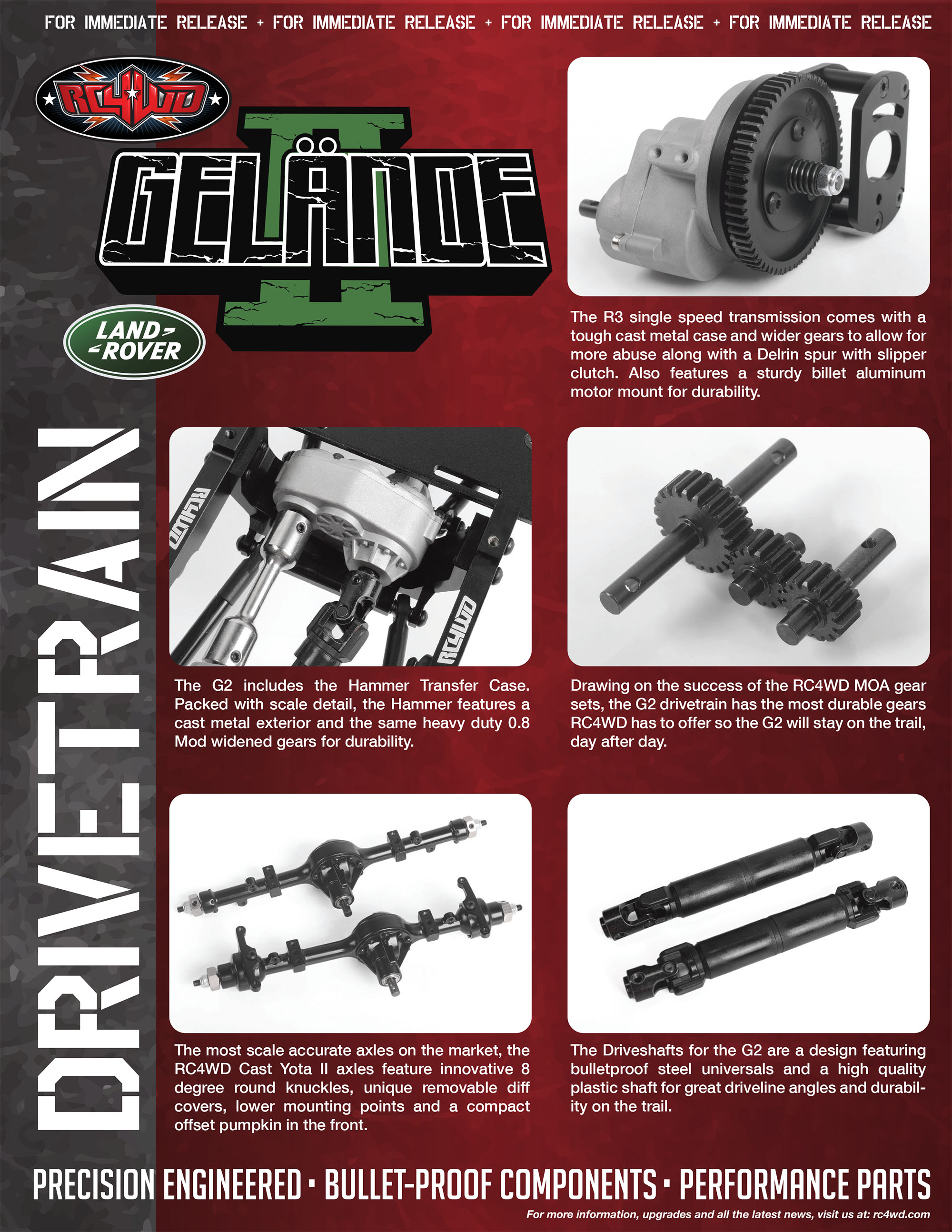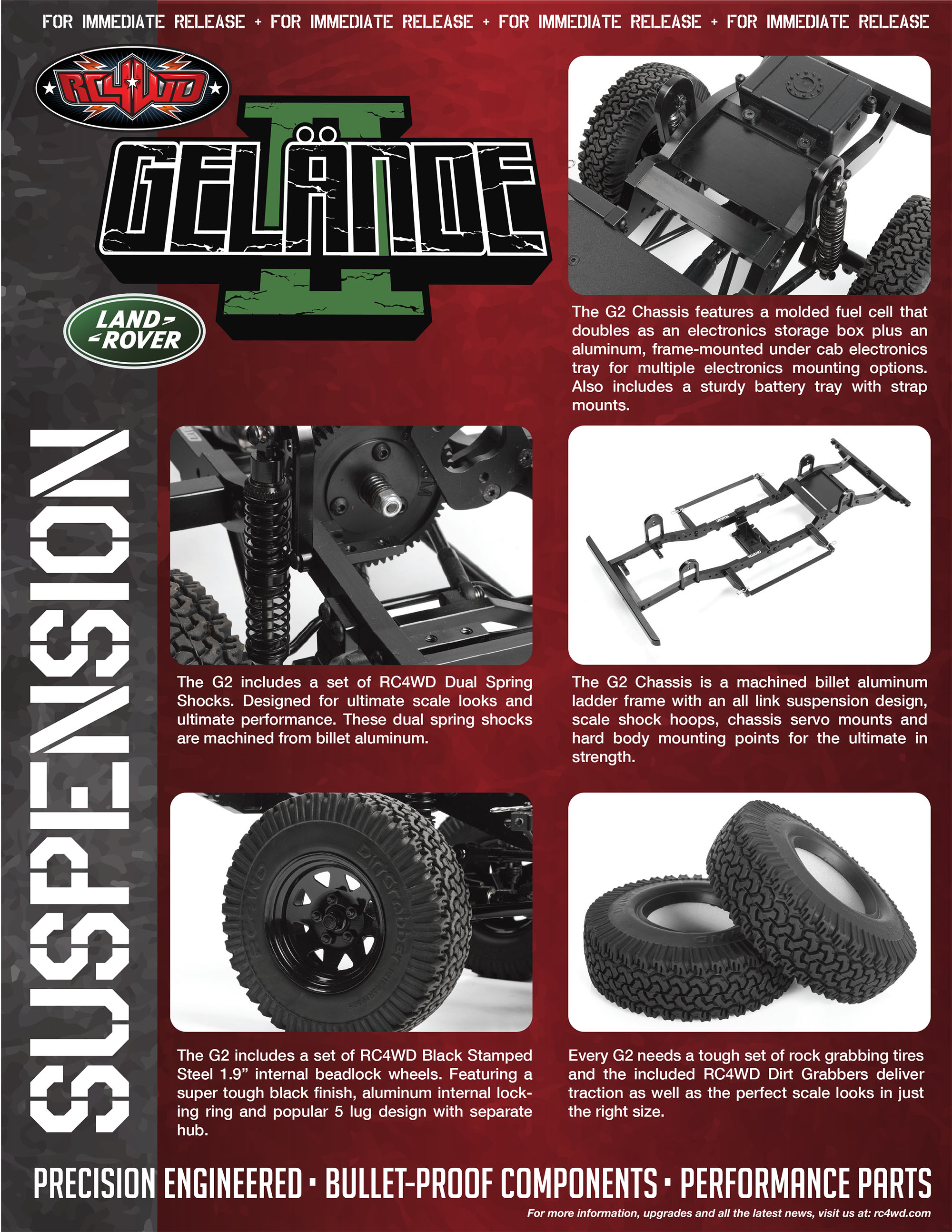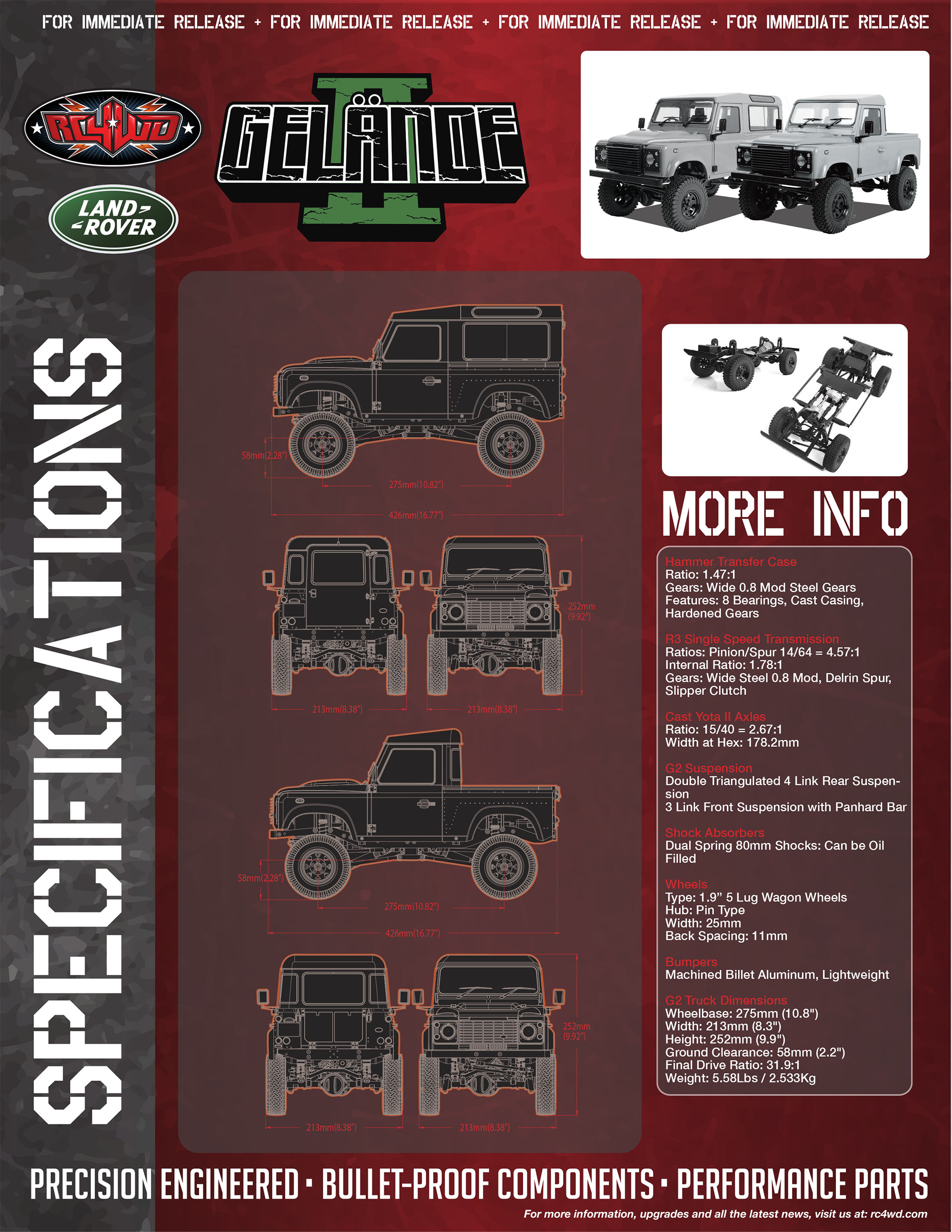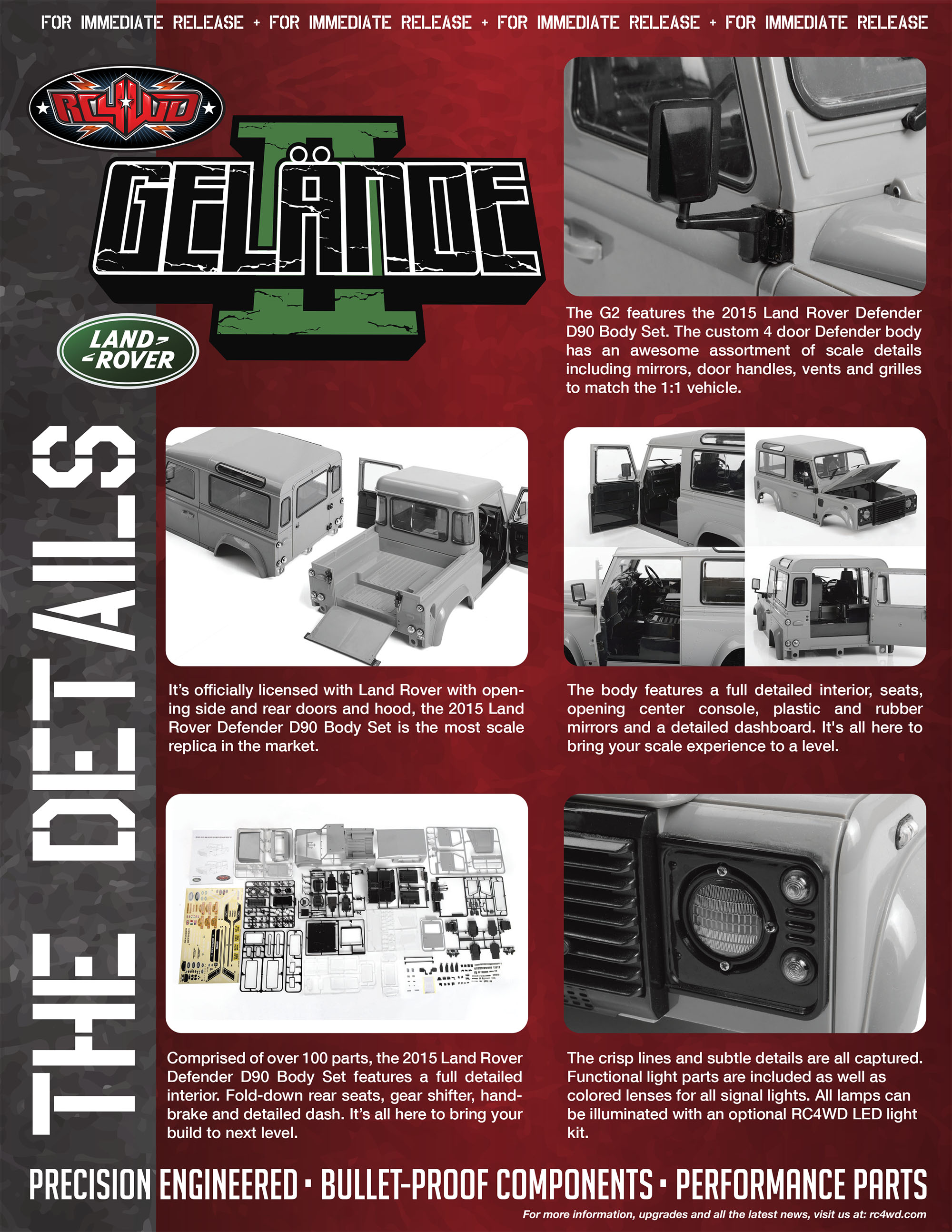 The G2 features the 2015 Land Rover Defender D90 Body Set. The custom 4 door Defender body has an awesome assortment of scale details including mirrors, door handles, vents and grilles to match the 1:1 vehicle.