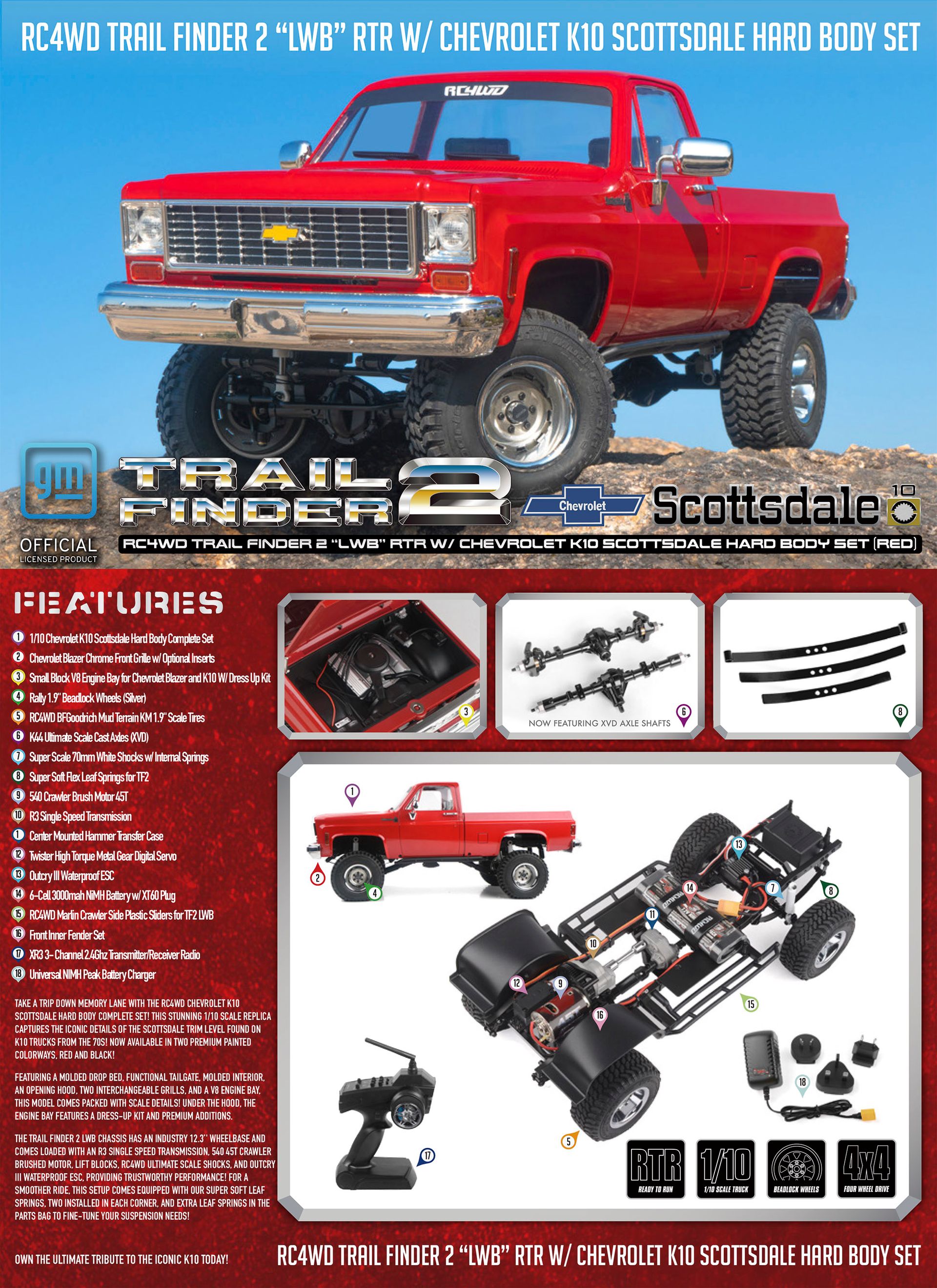 The Trail Finder 2 "LWB" Chassis is powered by the tough and durable RC4WD 45 Turn Crawler Motor. With long-lasting performance at its core, this power machine is tuned for rock climbing and scale driving!