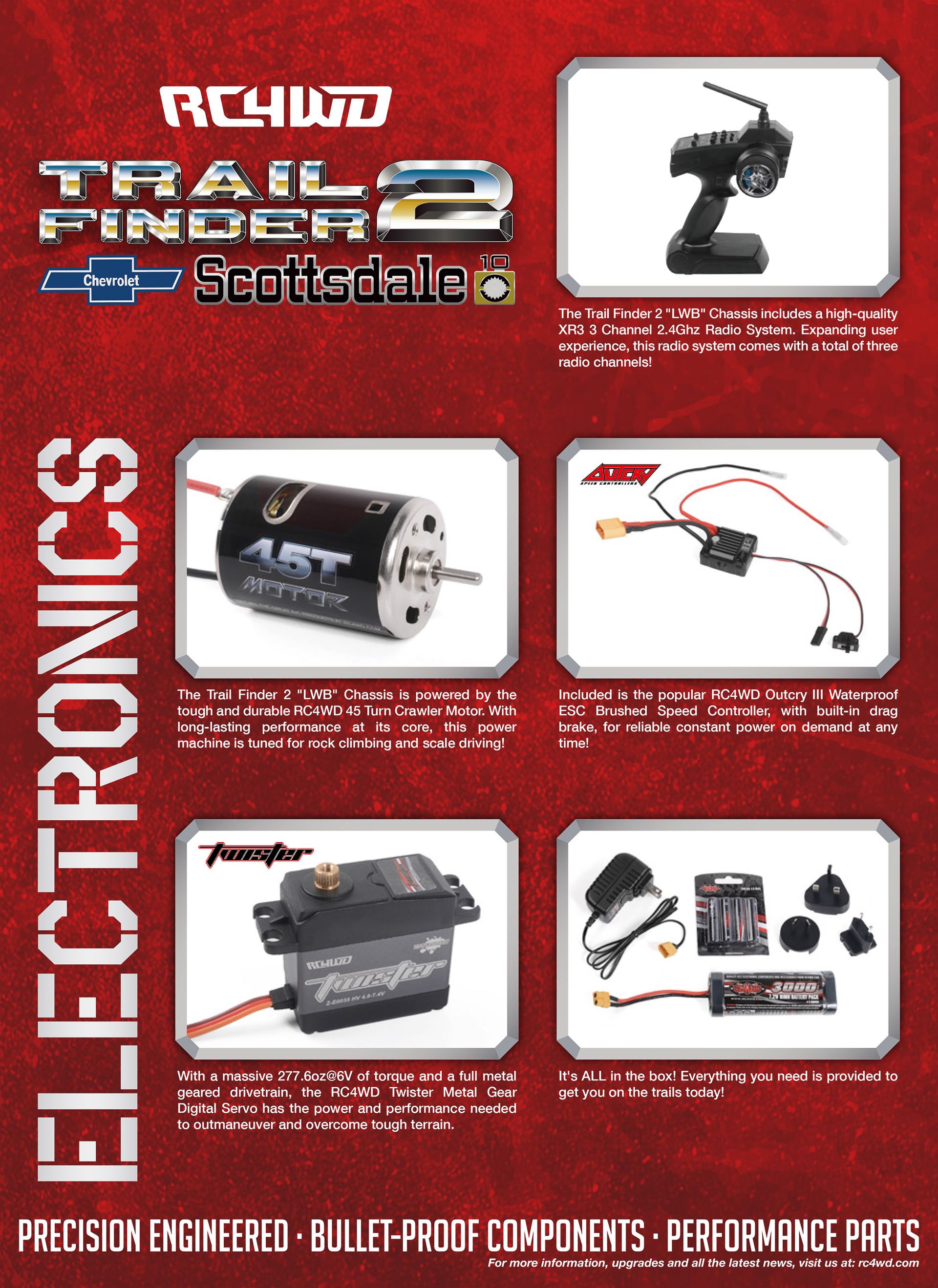 Included is the popular RC4WD Outcry III Waterproof ESC Brushed Speed Controller, with built-in drag brake, for reliable constant power on demand at any time.