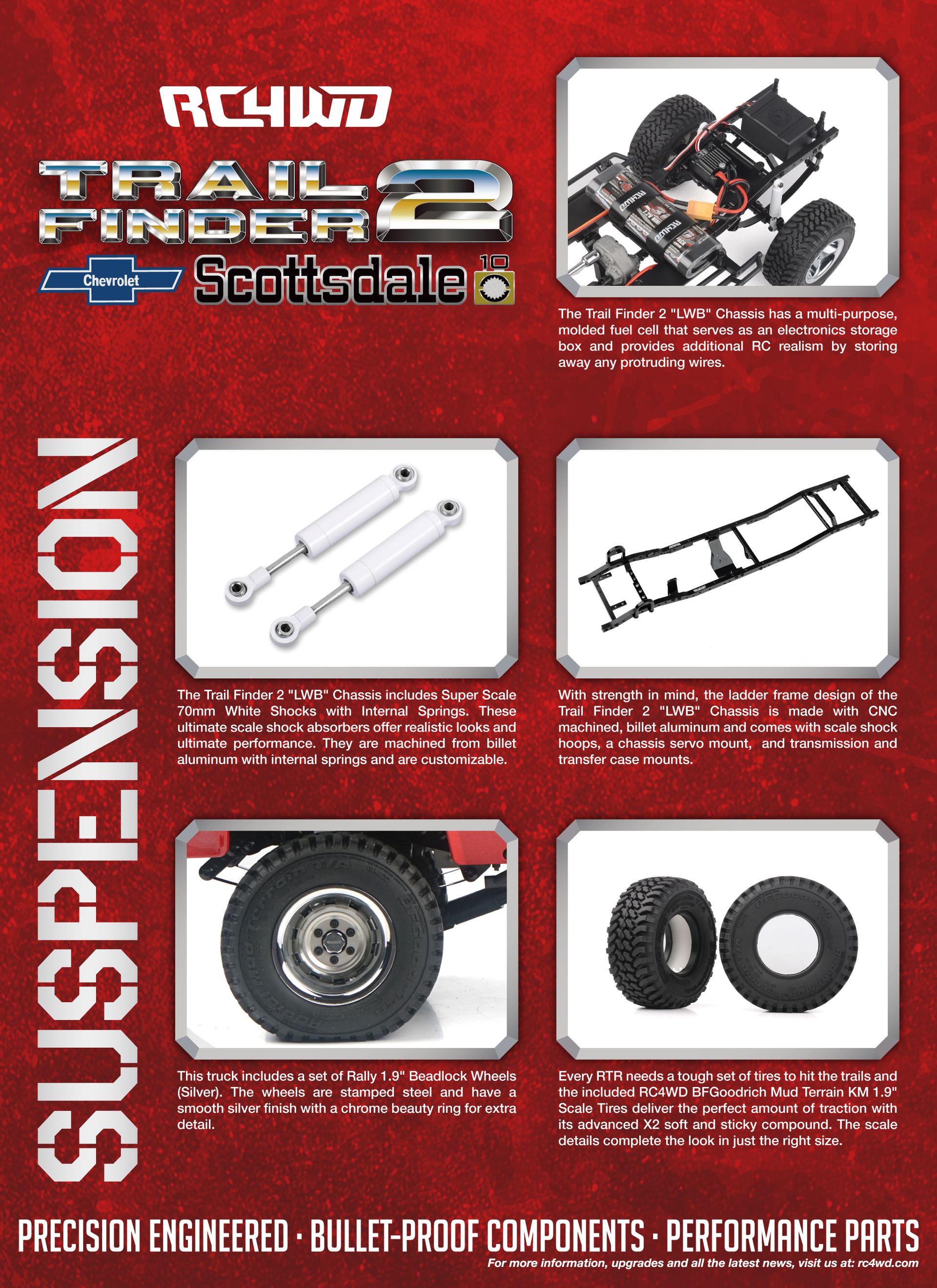The Trail Finder 2 "LWB" Chassis includes Super Scale 70mm White Shocks with Internal Springs. These ultimate scale shock absorbers offer realistic looks and ultimate performance. They are machined from billet aluminum with internal springs and are customizable. Drawing on the success of the RC4WD MOA Gear Sets, the Trail Finder 2 "LWB" Chassis has the most durable gears RC4WD has to offer, capable of staying on the trail day after day.