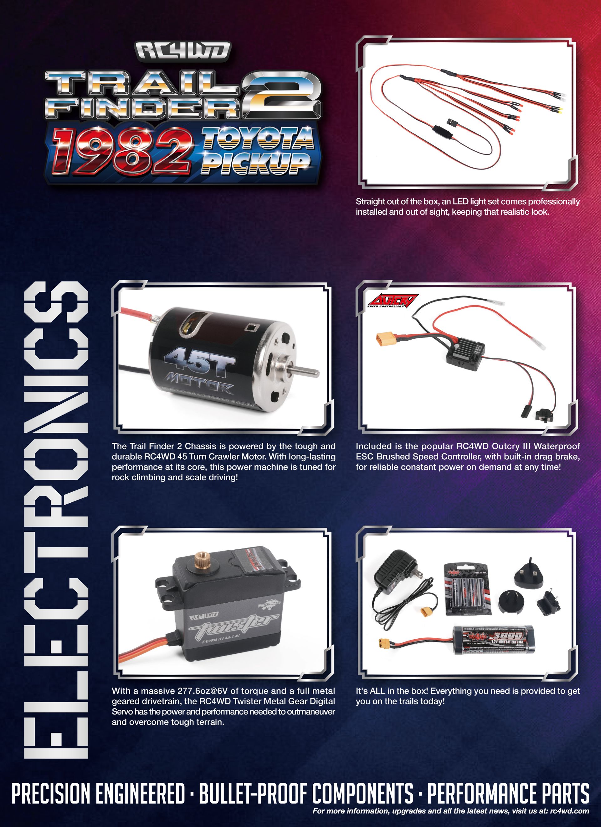 The Trail Finder 2 Chassis is powered by the tough and durable RC4WD 45 Turn Crawler Motor. With long-lasting performance at its core, this power machine is tuned for rock climbing and scale driving!