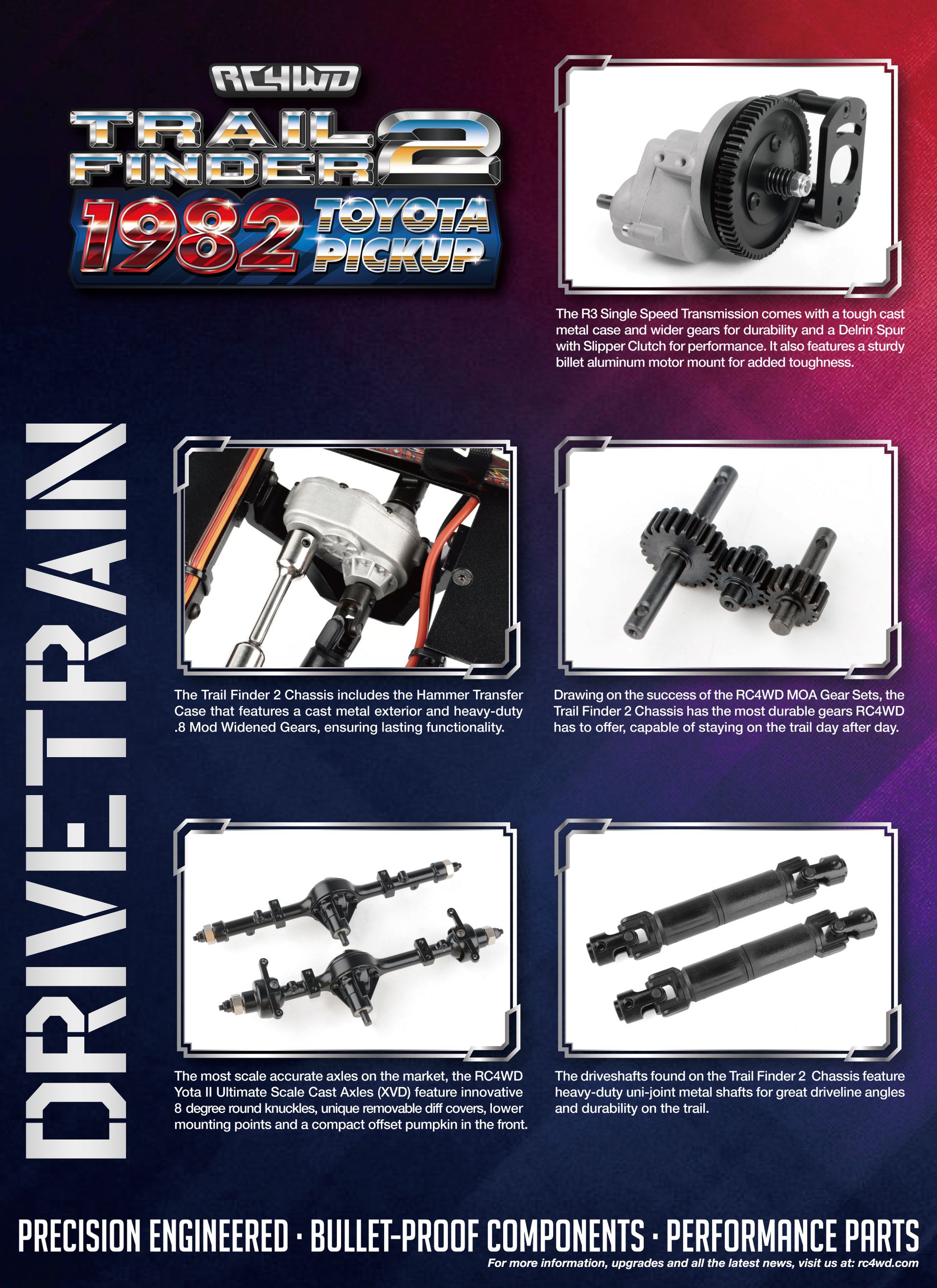 Drawing on the success of the RC4WD MOA Gear Sets, the Trail Finder 2 Chassis has the most durable gears RC4WD has to offer, capable of staying on the trail day after day.