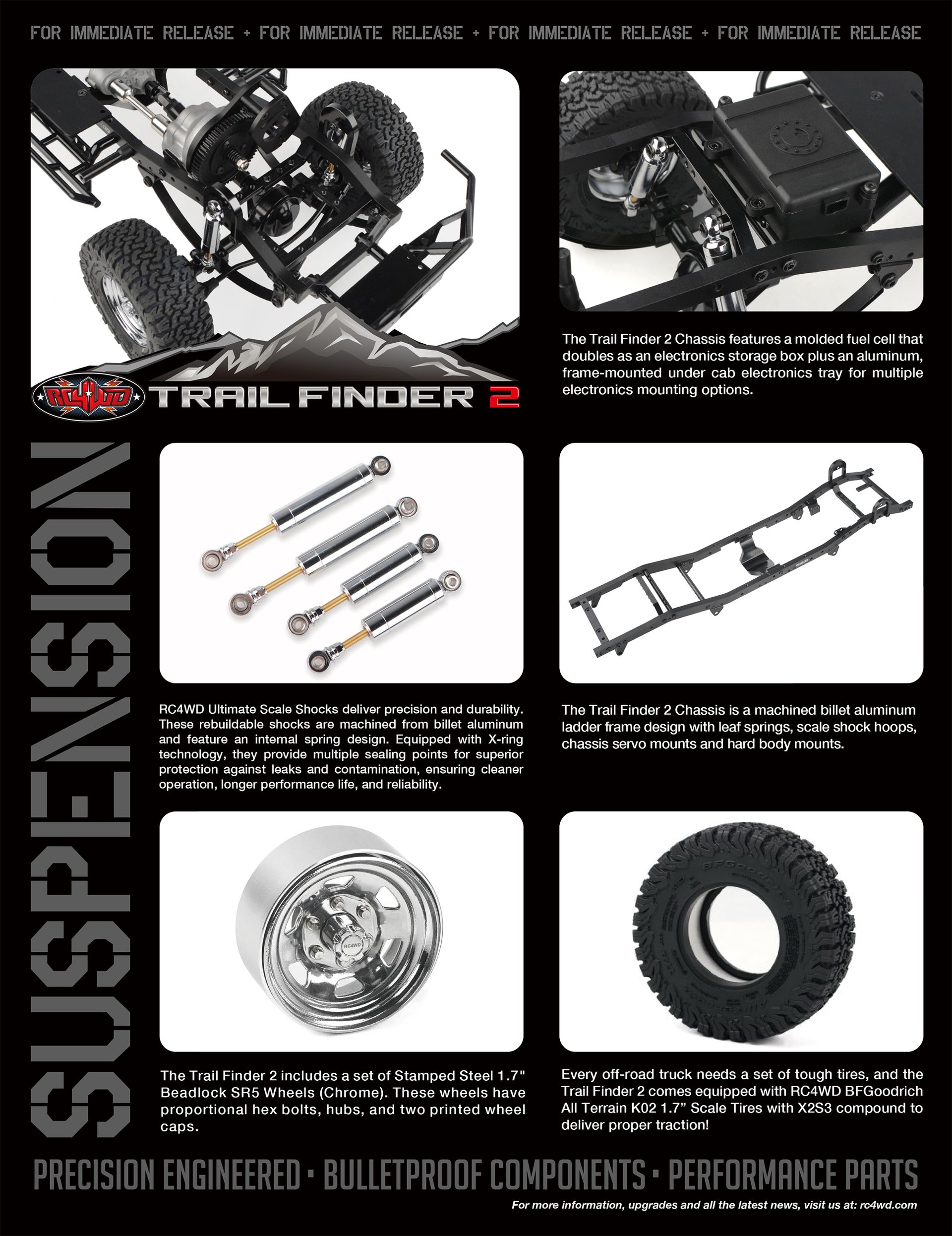 Every off-road truck needs a set of tough tires, and the Trail Finder 2 comes equipped with RC4WD BFGoodrich All Terrain K02 1.7” Scale Tires with X2S3 compound to deliver proper traction!