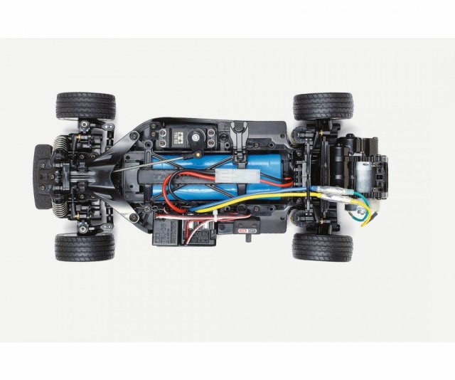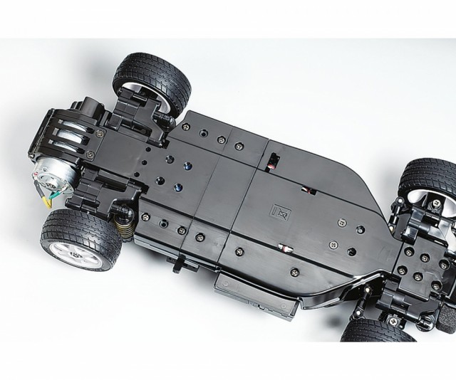 Improved RR Performance from the M-06 The M-06 chassis features a Rear-Mounted Motor, Rear-Drive setup and features a longitudinally-mounted battery pack, with R/C units positioned on either side for optimum balance and a low center of gravity. 4-wheel double wishbone suspension uses metal-plated wheels exactly like those on the real car, equipped with 60D radial tires at the front and 60D super grip tires at the rear. In addition, a 3-piece steering linkage offers nimble handling response. |