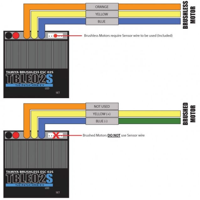 This ESC is especially designed for use with the TBLM series of Tamiya Brushless Motors (Sensored-Type, 10.5T, 12.5T, 14.5T, 16.5T). Brake and neutral brake settings can be adjusted independently, and it features 3 protection systems against overheating, overloading and low voltage. It is also compatible with brushed motors (Normal Type 540 and Sports-Tuned Motors 25 Turn or higher). Note: When using servos with a current exceeding 1.5A, BEC output may be shut down.