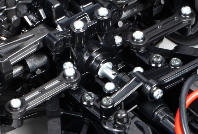 • 4-bevel differential gears and 4-wheel double wishbone suspension.